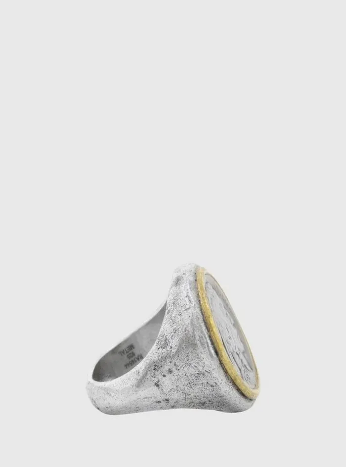 Jewelry with attitude – this ring is crafted from sterling silver and brass. Detailed with a distressed finish. Brass/Sterling SilverSize 10Metal featurePrimary Stone: CoinHandcrafted in Istanbul
