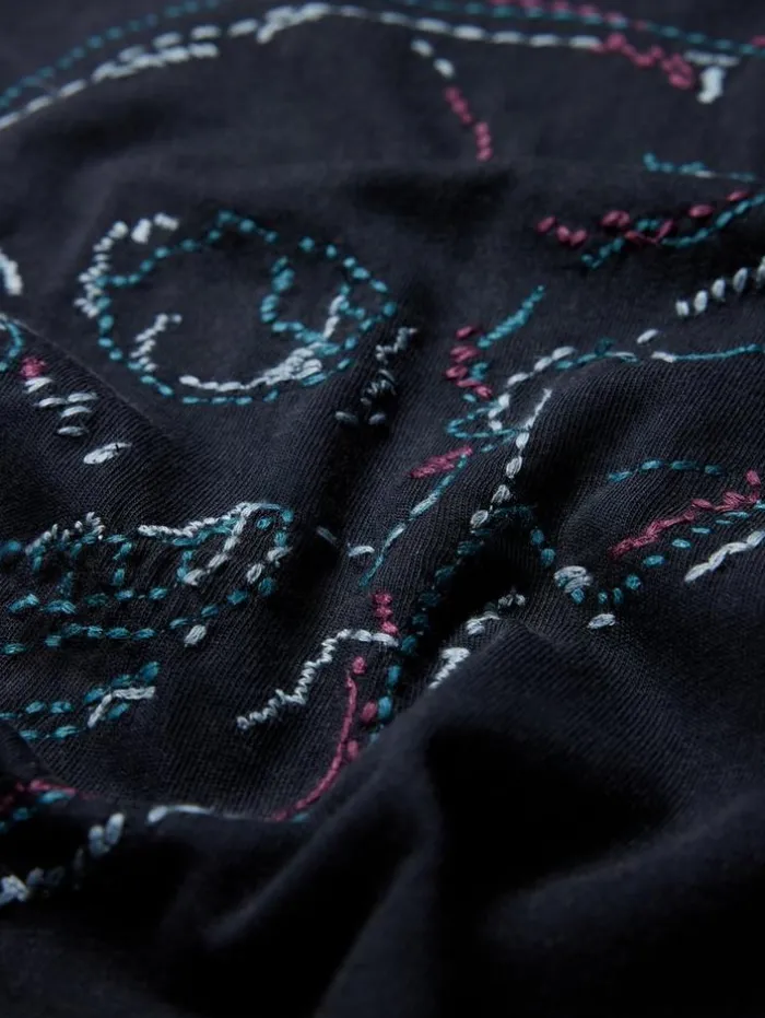 Skull tees never grow old in our opinion, they embody our timeless attitude. Loosely stitched and embroidered, this offers a dynamic interpretation of a classic. It’s our signature t-shirt completed with raw edge detailing. 100% CottonMachine Wash ColdCrew NeckShort Sleeves Raw Edge DetailingEmbroidered Skull ArtworkMeasurements: Front Body Length: 28″, Chest: 20.5″, Across Shoulder: 18″, Flat Sleeve Length : 16.75″