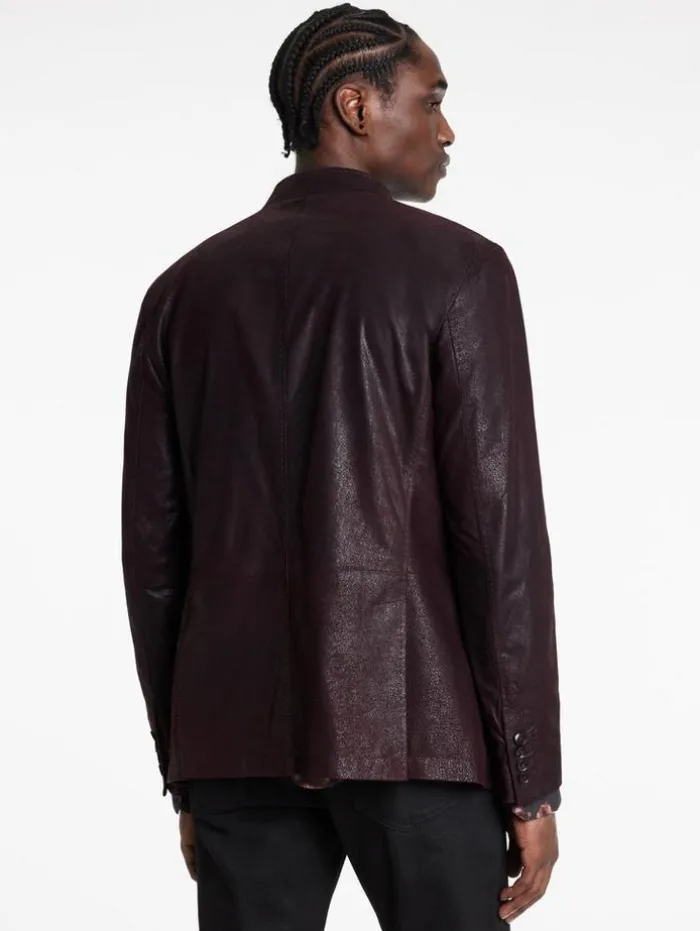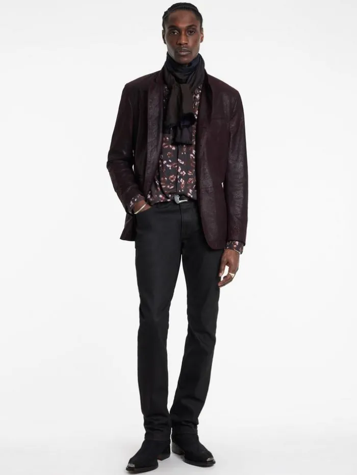 Reflecting the quintessential JV aesthetic, our Varick Jacket melds modern design with timeless appeal. Expertly crafted from fine lambskin sourced from the United Kingdom, this slim-fit jacket undergoes a meticulous process: dyed in traditional wooden drums, air-dried at room temperature, and then hand-buffed to achieve a distinct vintage effect. The wire-inserted stand peak lapel sharpens its sleek, single-breasted silhouette, while the specialized buffing and thinning treatment bestows the jacket with unparalleled lightness and a rugged tactile depth. From casual daywear to sophisticated evening attire, the Varick Jacket epitomizes JV’s signature blend of luxury and rebellious spirit.100% Lamb SuedeProfessional Dry Cleaned By Leather ExpertSlim FitMulti-Button ClosureSingle-BreastedWire-Inserted Stand Peak LapelSpecialized Finishing ProcessMeasurements: Body Length: 30″, Chest Width (Flat): 21.25″, Shoulder Width: 18.75″, Sleeve Length: 26″