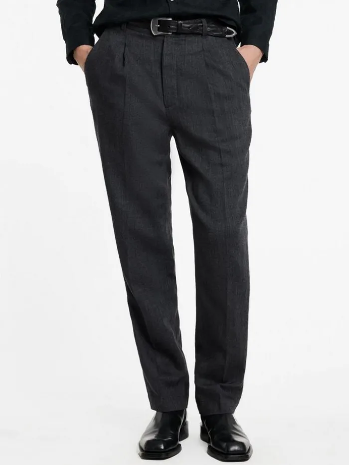 Our Benedict Pants bring sharp pleats to the forefront, now reimagined in a herringbone tweed that transitions effortlessly across style spectrums. These slim-fit pants are crafted from a light and spare herringbone tweed with an open and slightly transparent weft, offering a look that’s both sophisticated and daring. The tweed’s inherent softness ensures a wrinkle-free appearance, perfect for maintaining a polished look throughout the day. Moreover, these pants undergo a special “wavy” finishing process before being crushed, adding a distinctive texture and dynamic flair that underscores their unique appeal.100% WoolSlim FitZipper FlyPleated DetailingMeasurements: Waist: 85cm, Hip: 114cm, Inseam: 80cm