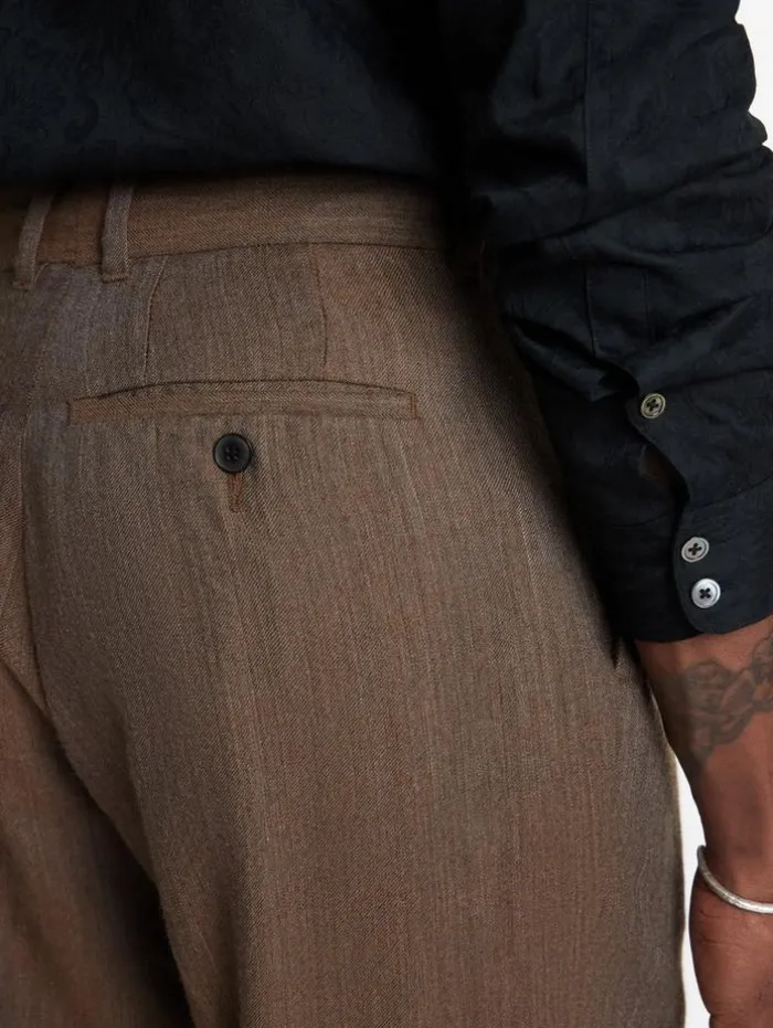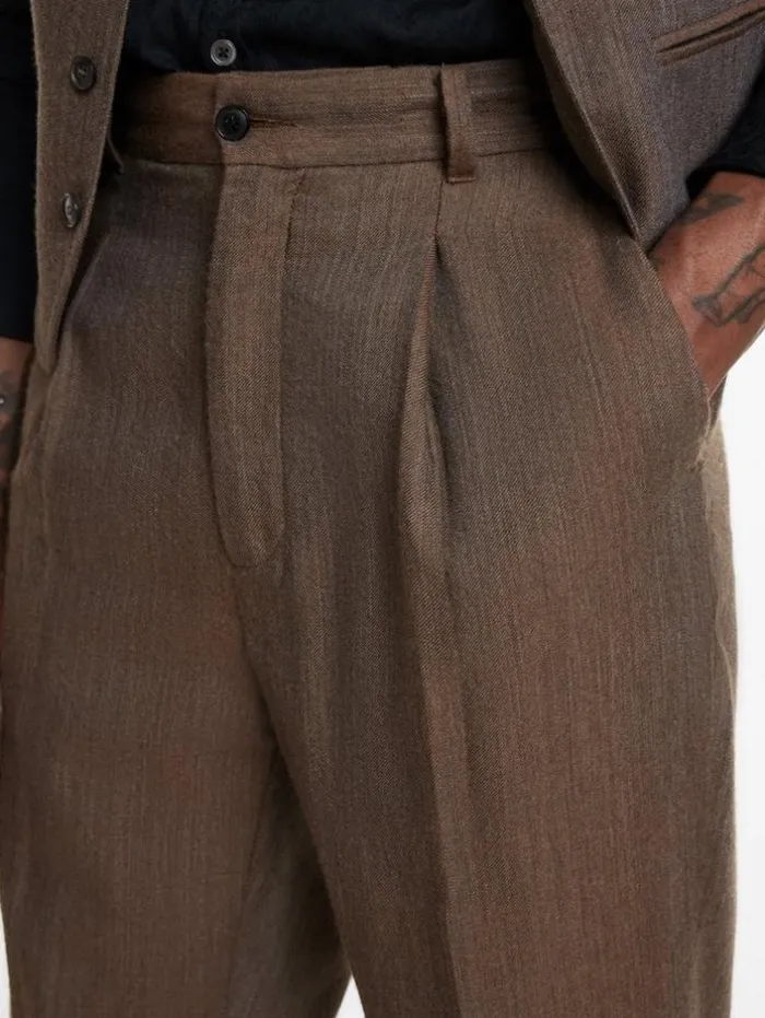 Our Benedict Pants bring sharp pleats to the forefront, now reimagined in a herringbone tweed that transitions effortlessly across style spectrums. These slim-fit pants are crafted from a light and spare herringbone tweed with an open and slightly transparent weft, offering a look that’s both sophisticated and daring. The tweed’s inherent softness ensures a wrinkle-free appearance, perfect for maintaining a polished look throughout the day. Moreover, these pants undergo a special “wavy” finishing process before being crushed, adding a distinctive texture and dynamic flair that underscores their unique appeal.100% WoolSlim FitZipper FlyPleated DetailingMeasurements: Waist: 85cm, Hip: 114cm, Inseam: 80cm