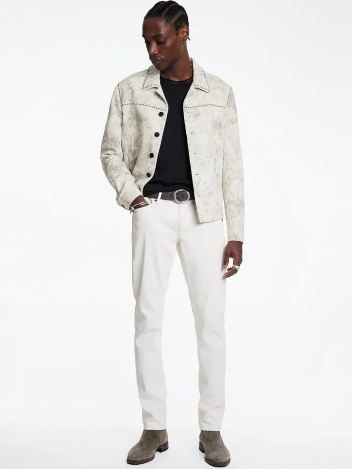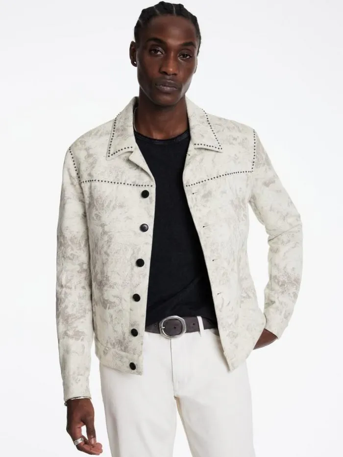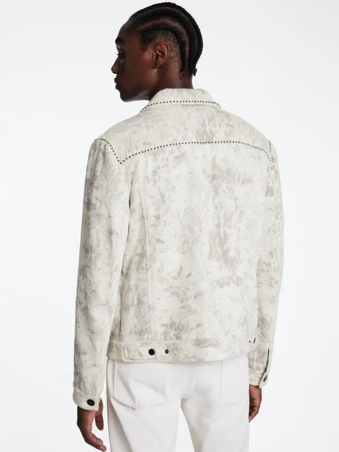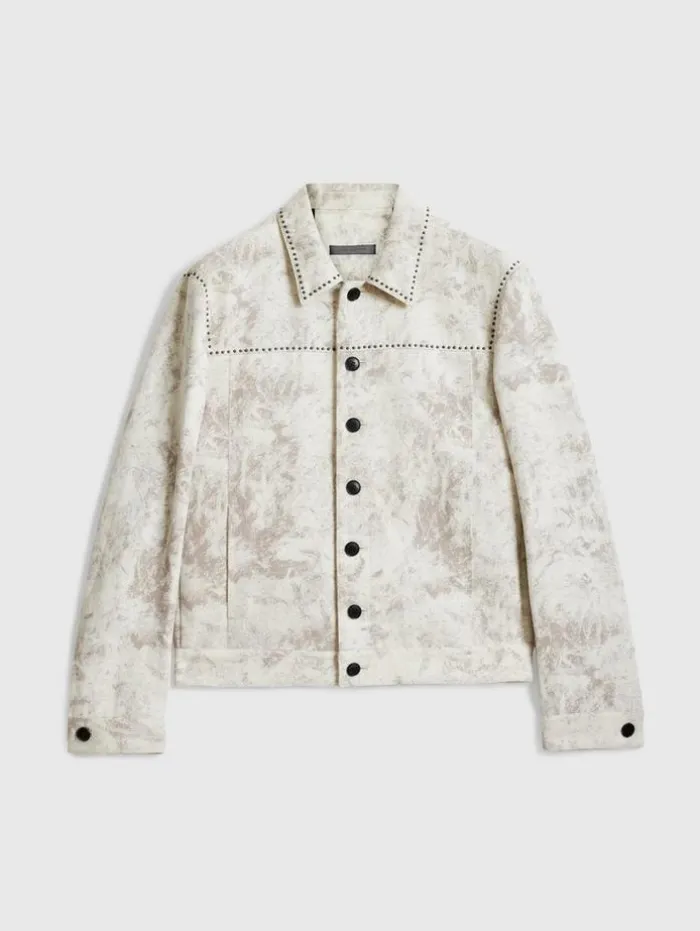 Embrace the daring edge of the limited edition Cardin Trucker, a studded rendition of the classic trucker jacket that’s sure to turn heads. Adorned with meticulous stud detailing along the front and back yoke seams, shoulder seams, and collar edge, this jacket is a celebration of bold style and meticulous craftsmanship. Each jacket is cut from fine Italian fabric featuring random prints, lending an air of exclusivity as no two pieces are exactly alike. The Cardin Trucker is designed for those who value a garment that’s as unique as their personal style. 85% Cotton, 15% LinenLining: 100% CuproDry Clean Only Limited EditionButton ClosureStudded AccentsFine Italian Fabric With Random PrintsMeasurements: Front Body Length: 26”, Center Back Body Length: 25.25”, Across Shoulder: 19.25”, Chest: 21.625” Flat, Sleeve Length: 25.5