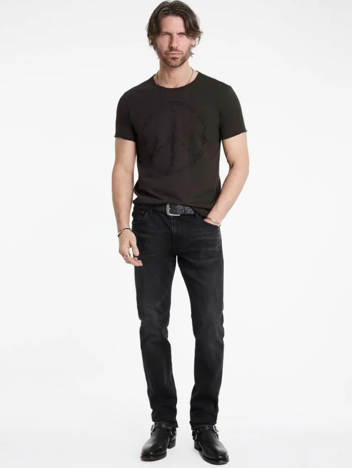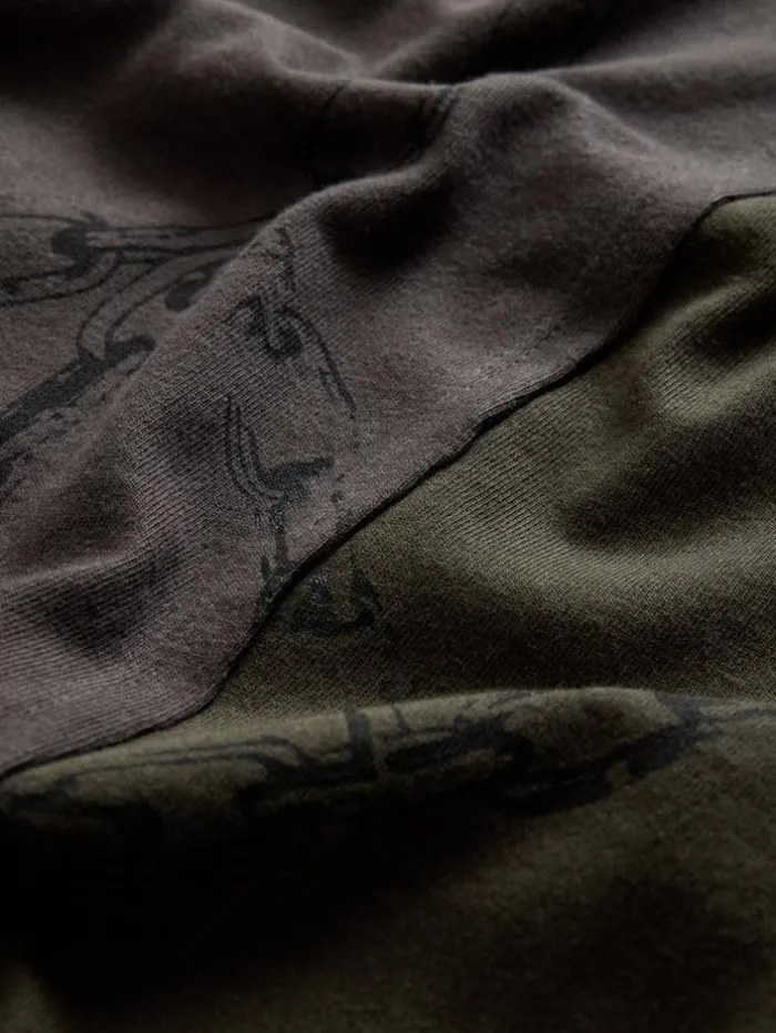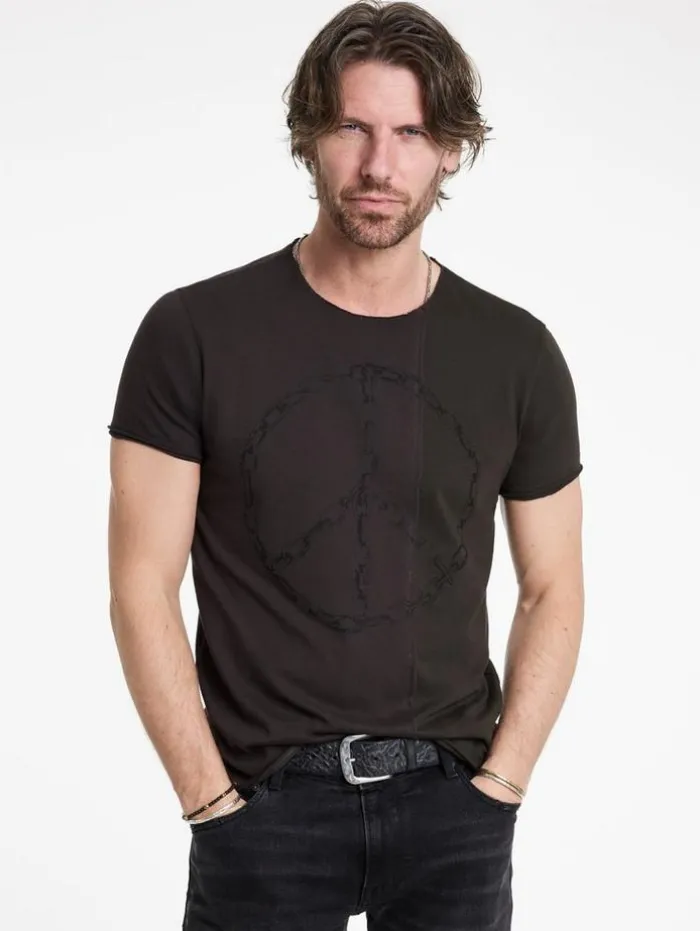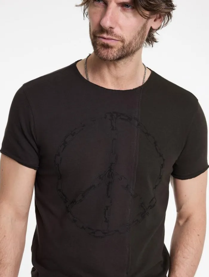 Rebel with a cause in our Chain Peace Tee. Two contrasting panels clash, sewn with raw edge seams that disrupt the norm. Made from organic cotton, the chain-crafted peace sign printed across the seams delivers a strong visual impact with a worn-in appearance. Its relaxed fit makes it versatile enough to wear on its own or as a standout base layer.100% Organic CottonMachine Wash ColdCrew NeckShort SleeveRaw Edge DetailChain Peace ArtworkMeasurements: Body Length: 28″, Chest Width (Flat): 20.5″, Sleeve Length: 16.75″