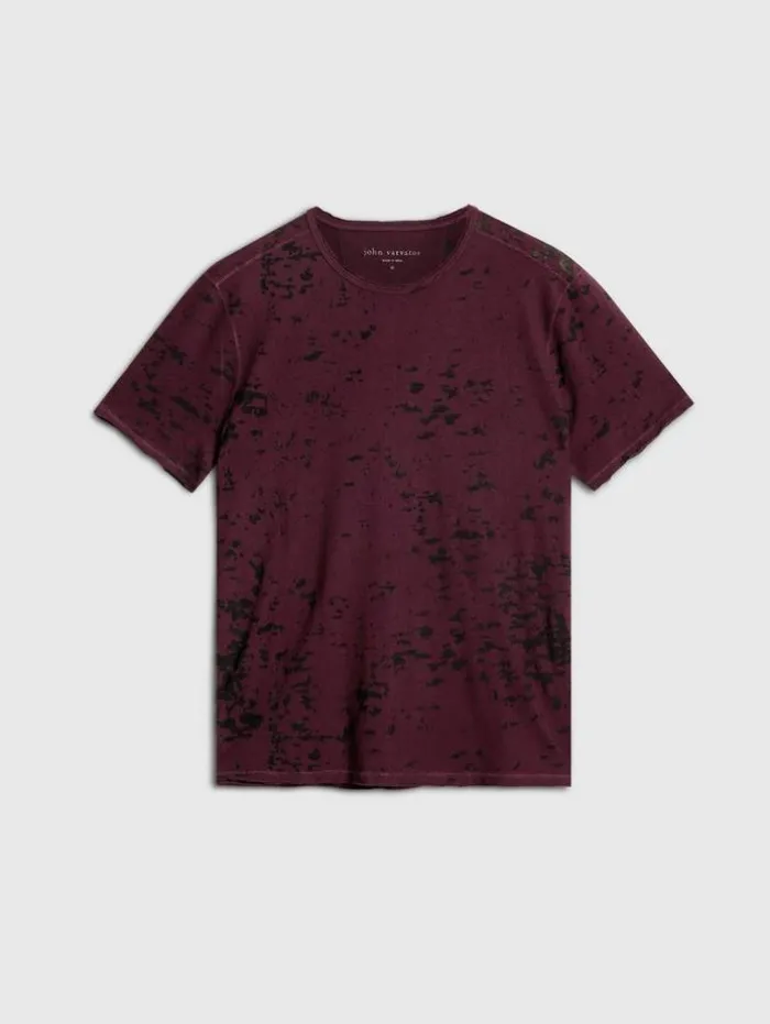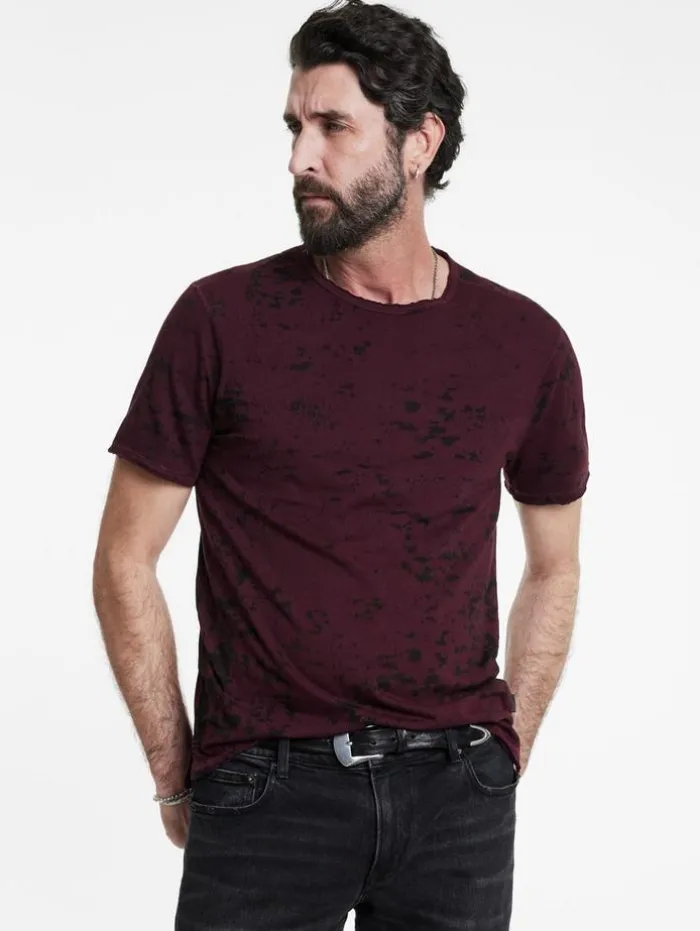 Every detail in our Eden Burnout Crew speaks volumes. Slip on this organic cotton blend tee for effortless cool. Its burnout pattern weaves through the fabric, enhanced by seams highlighted with vertical pickstitching. Its timeless silhouette features a side slit for exceptional comfort, while raw edge trims along the neck, cuffs, and hem infuse a rugged touch. Our signature flag label on the side marks its authenticity and quality craftsmanship.60% Organic Cotton, 40% PolyesterMachine Wash ColdCrew NeckPulloverShort SleeveRaw Edge DetailSignature Flag LabelMeasurements: Body Length: 27.5″, Chest Width (Flat): 20.5″, Sleeve Length: 17.5″