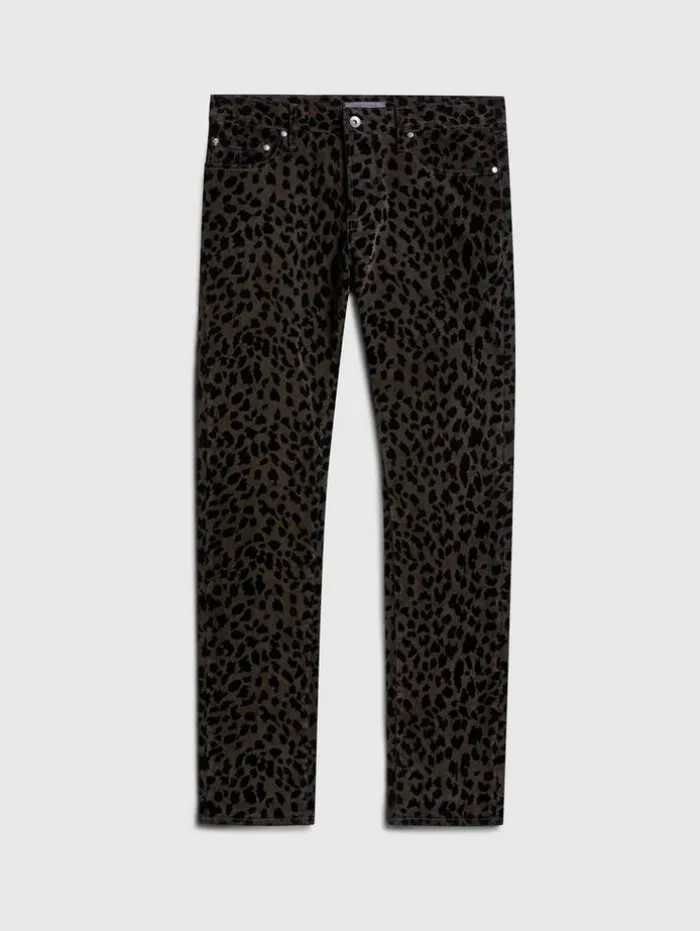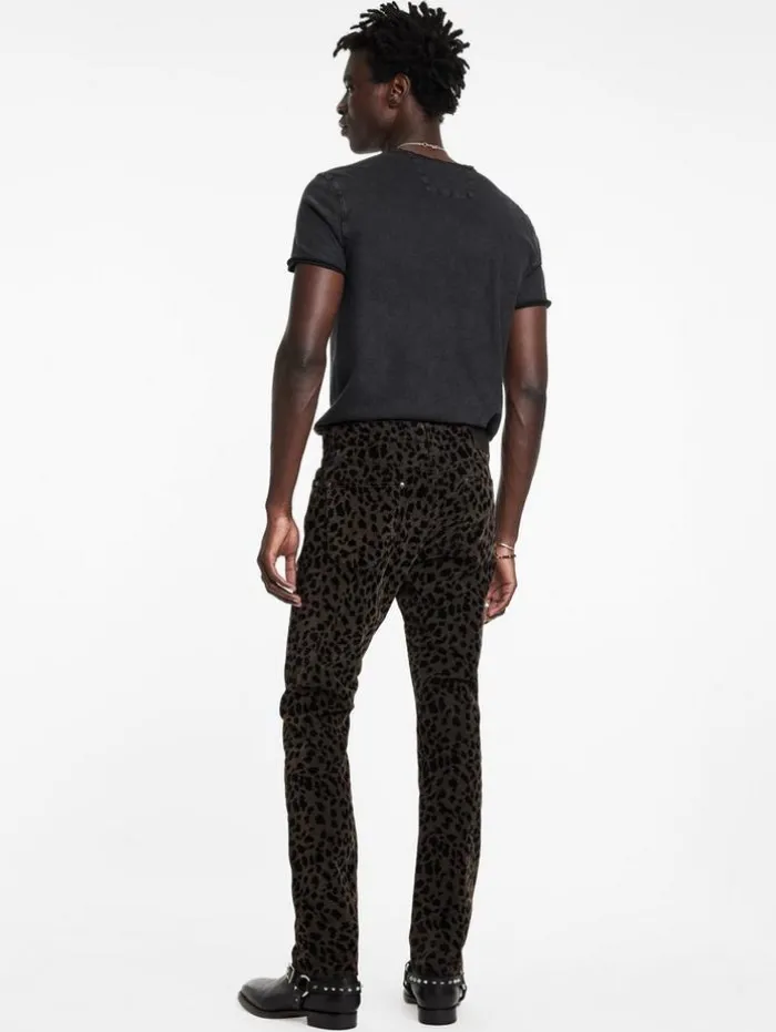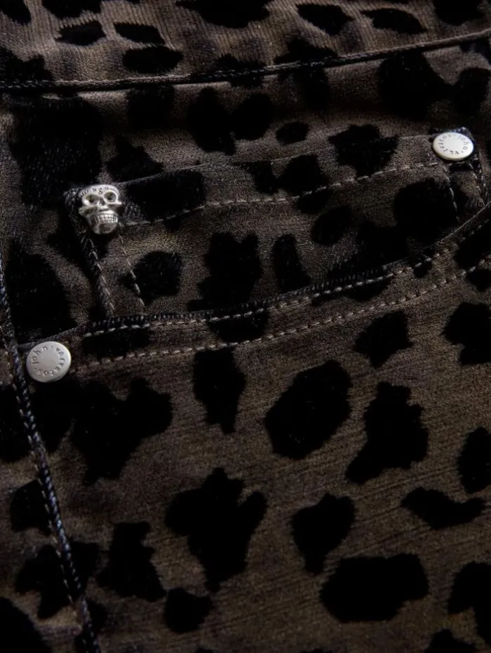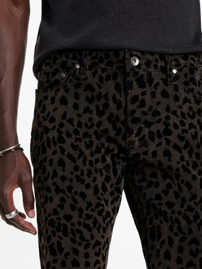 Resort ’24 introduces the Jack Wash pants, a bold leap into style with their slim-fit cotton construction and distinctive leopard print. An abradable flock treatment paired with precise laser printing on casual denim.98% Cotton, 2% ElastaneFinishing: 100% ViscoseMachine wash coldSlim-fitFive pocketsZip and button closureFlocked leopard patternLaser printingMeasurement: Waist: 34″, Hip: 40.5”, Inseam: 33″
