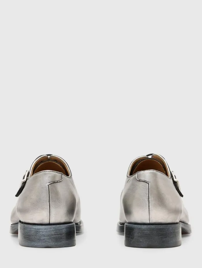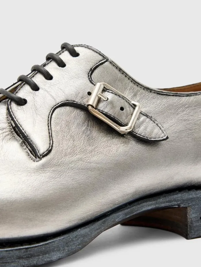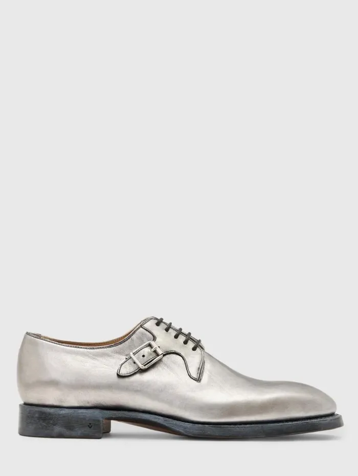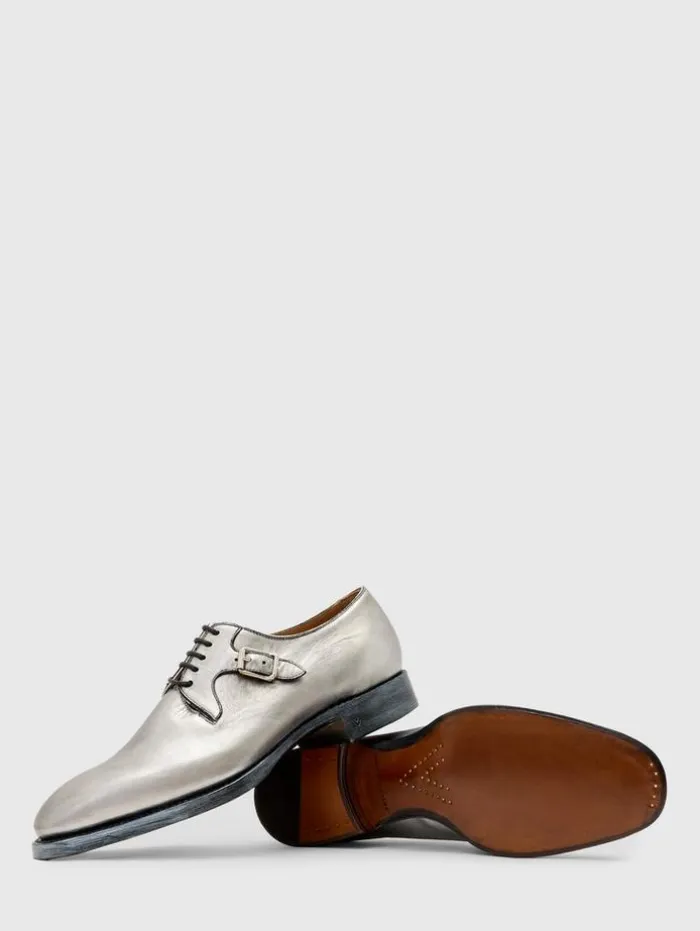 Resort ’24 marks the audacious return of the Regent Derby, crafted from unique silver foil-coated calf leather. Each step is a statement of chiseled, architectural design, accented by meticulously placed deco hardware. Beneath this shimmering exterior, the integrity of true Goodyear Welt construction and a fully hand-stained leather sole affirm its lasting quality. Elegant yet comfortable, this silhouette effortlessly completes any tailored ensemble this season.Upper: 100% Genuine LeatherSole: 100% Genuine LeatherFull calf leather liningProfessional care by leather expertSilver foil coated calf leatherHandstained leather sole Signature deco hardwareMade in Italy