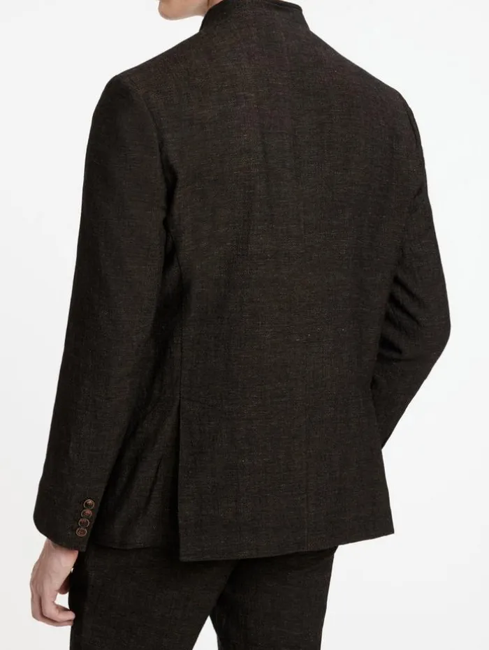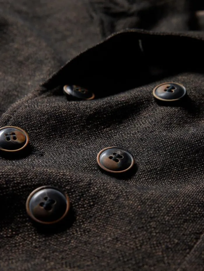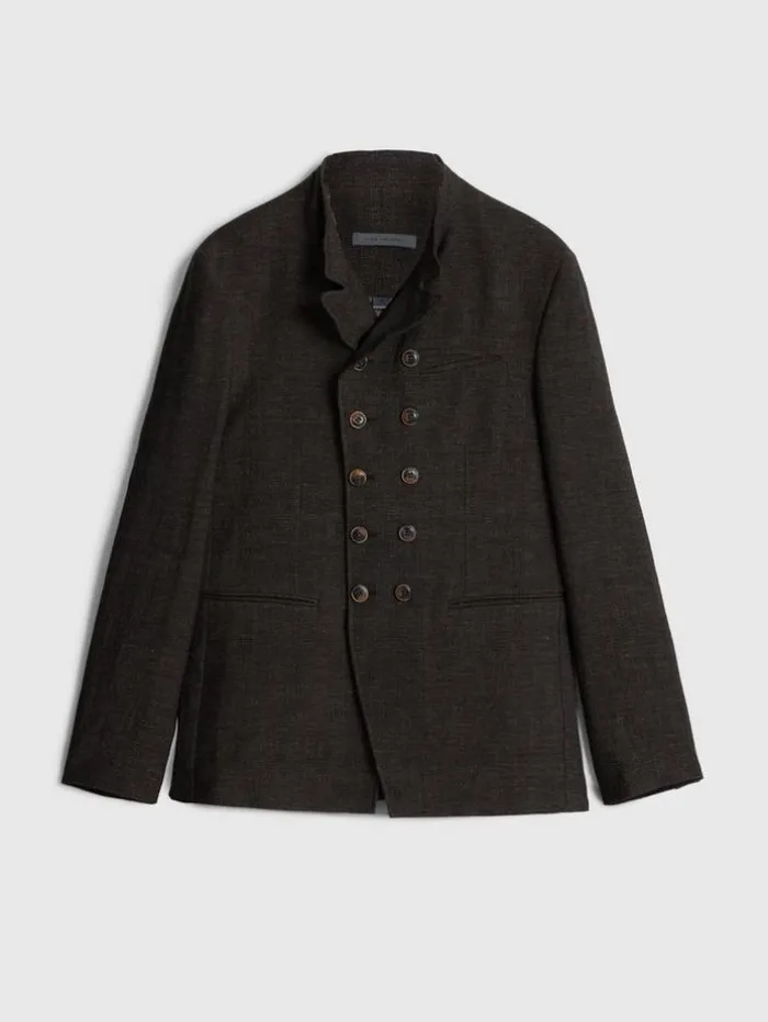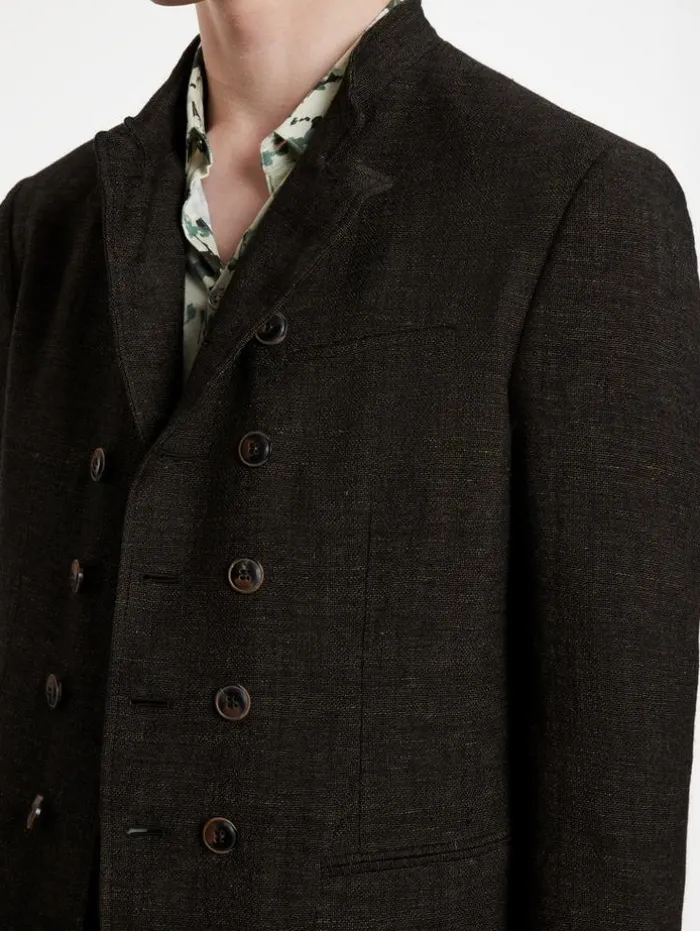 Elegant touches take miltary aesthetics to a new level. The Upson Jacket is made from a luxury wool-linen blend fabric. The double breasted silhouette features a wire inserted collar and multiple buttons. 75% Wool, 25% Linen Dry Clean OnlyHook and Bar ClosureCollarSlim FitLong SleevesDouble BreastedWire Stand Up CollarMeasurements: Front Body Length: 79.5cm, Center Back Body Length: 73.5cm, Across Shoulder: 47.5cm, Chest: 54cm, Sleeve Length: 66cm