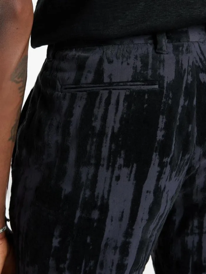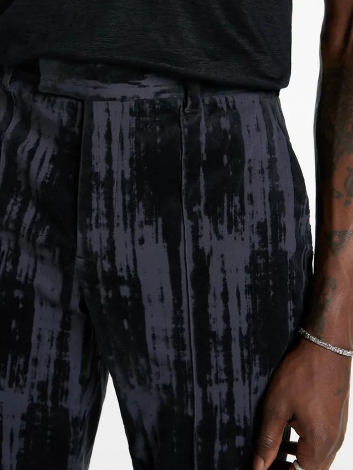 Tailored in a slim, straight fit, our Blake Pants exude a distinct allure. Drenched in the subtle pale purple hue of thistle, they boast a refined pintuck detail. The Italian velvet fabric showcases an abstract burnout print, meticulously crafted using the traditional cylinder method. This technique imparts a textured, three-dimensional finish, heightening the tactile appeal.75% Polyamide, 23% Cotton, 2% Elastane Dry Clean Only Slim, Straight Fit Zipper Fly Extended Waistband Welt Hip PocketsItalian Velvet FabricAbstract Burnout PrintTraditional Cylinder MethodThree Dimensional FinishMeasurements: Waist: 34″, Inseam: 32″