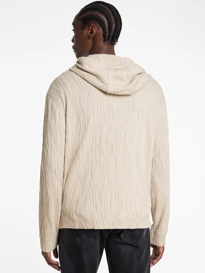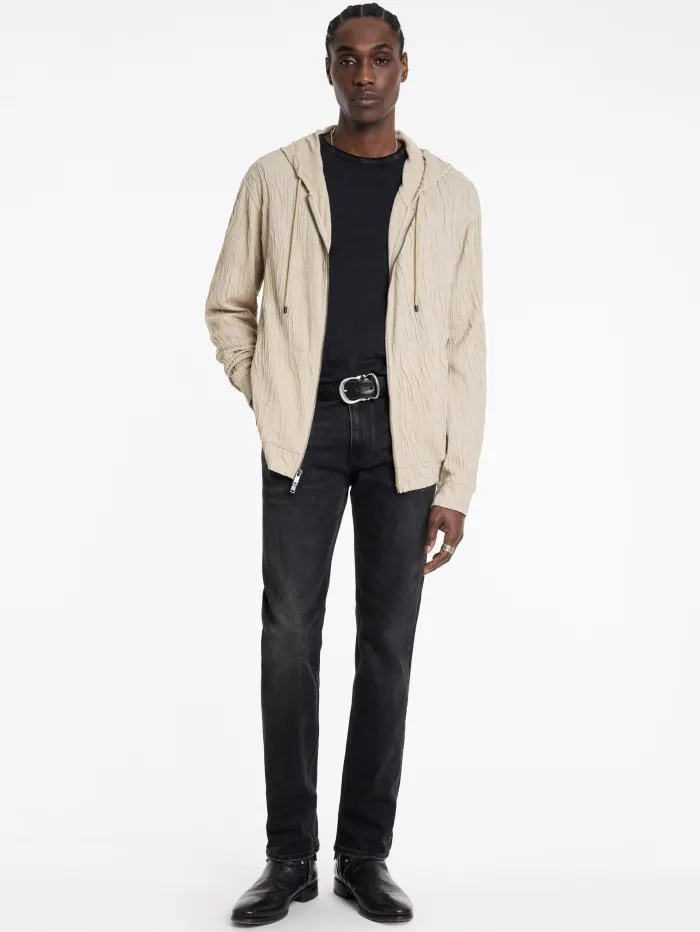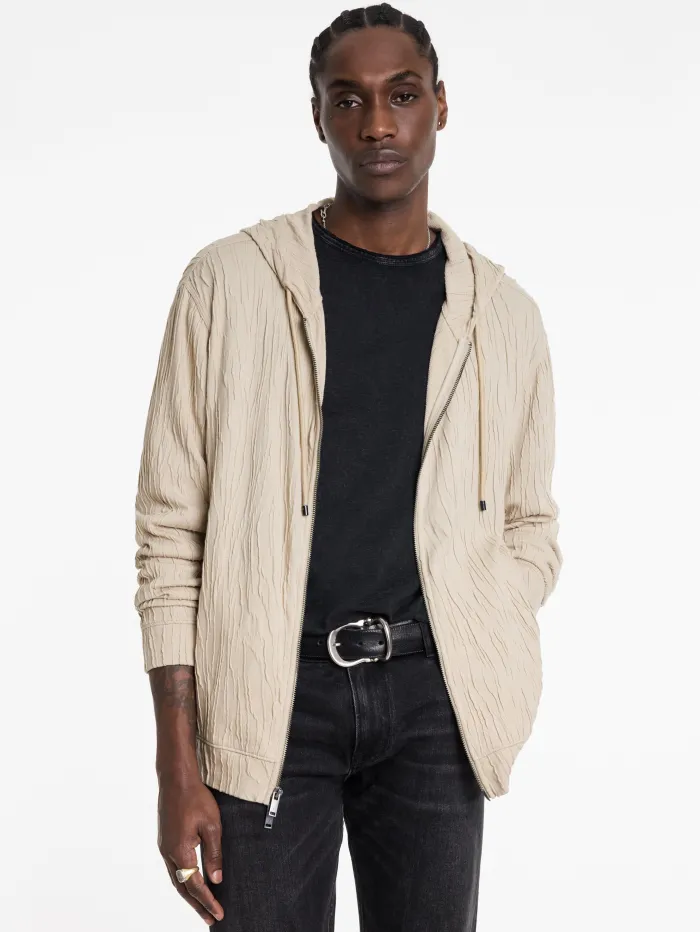Quiet luxury defines your off-duty days with the Ihsan Hoodie. It’s all in the feel of the jacquard fabric, where every thread speaks to relaxed sophistication and a distinctive tactile experience. The sleek metal double zipper, subtly embossed with the JV logo, adds the right amount of edge. Personalize the fit with adjustable drawstrings finished with our signature metal aglets. Practical single welt pockets add a sleek finish to the design. Layer this hoodie over a crisp tee or under a structured jacket to effortlessly enhance your look with visual allure. 99% Cotton, 1% Elastane Machine Wash ColdDouble ZipperLong SleeveDrawstringSingle Welt Waist PocketsTextured Jacquard FabricMeasurements: Body Length: 27″, Chest Width (Flat): 20.5”, Shoulder Width: 17.75”, Sleeve Length from Center Back: 34.5″