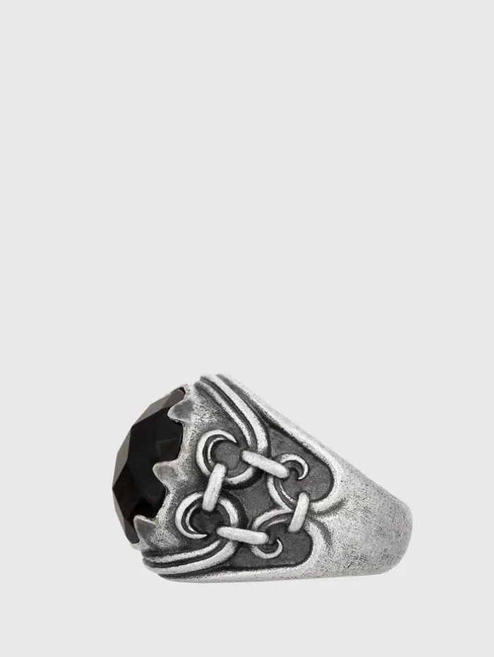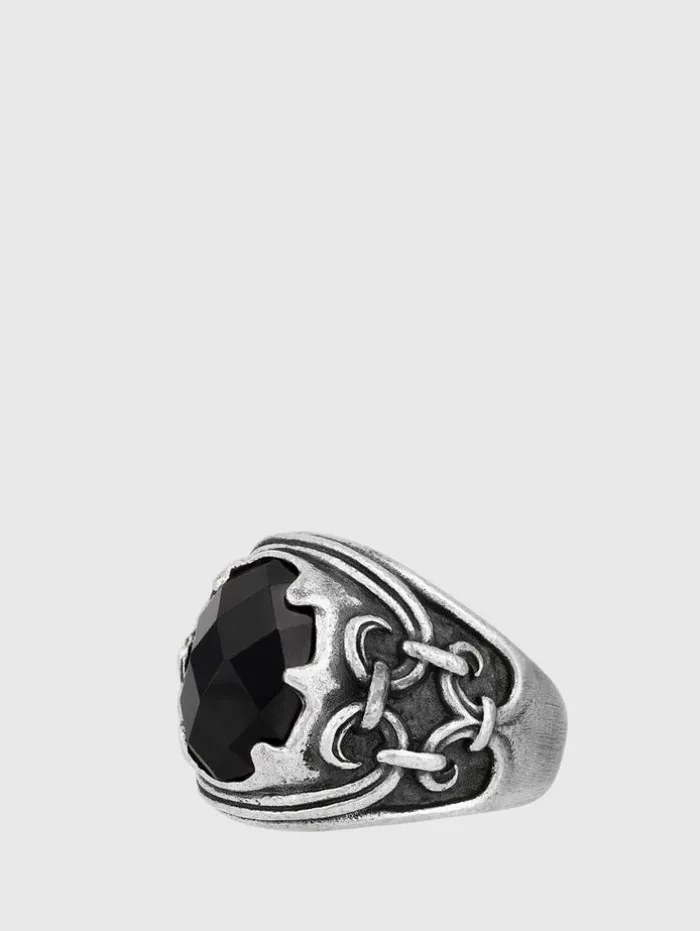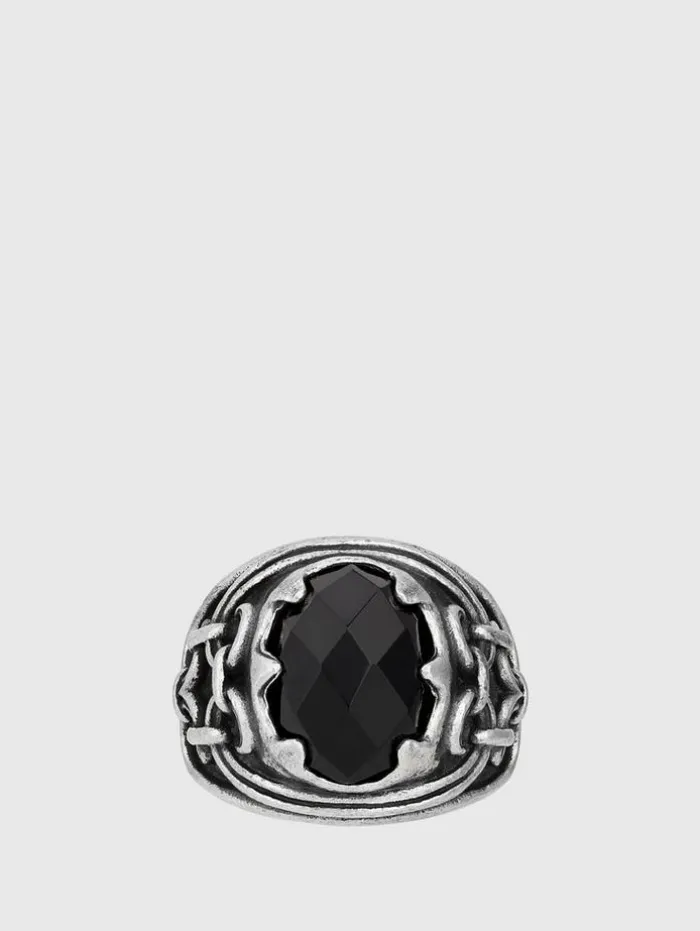 The John Varvatos Statement Ring introduces a convergence of craftsmanship and ornate Gothic architecture. Its intricately sculpted sterling silver sets a dramatic backdrop for the deep black onyx at its center, creating a bold contrast. Pair this piece with the All Around Bracelet for a unified look that elevates both evening and casual ensembles. Sterling SilverBand Width: 14.0 mmHeight Off Finger: 9.14 mmOther Dimensions: 17.50×15.0 mmOval StoneHandcrafted in Turkey