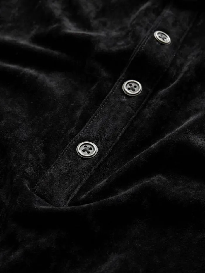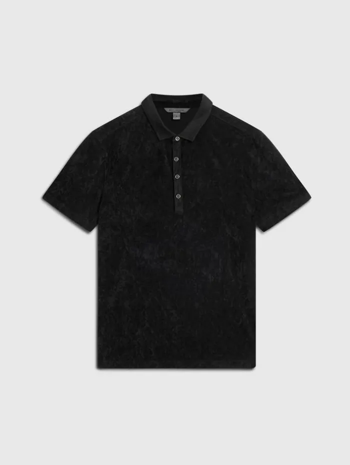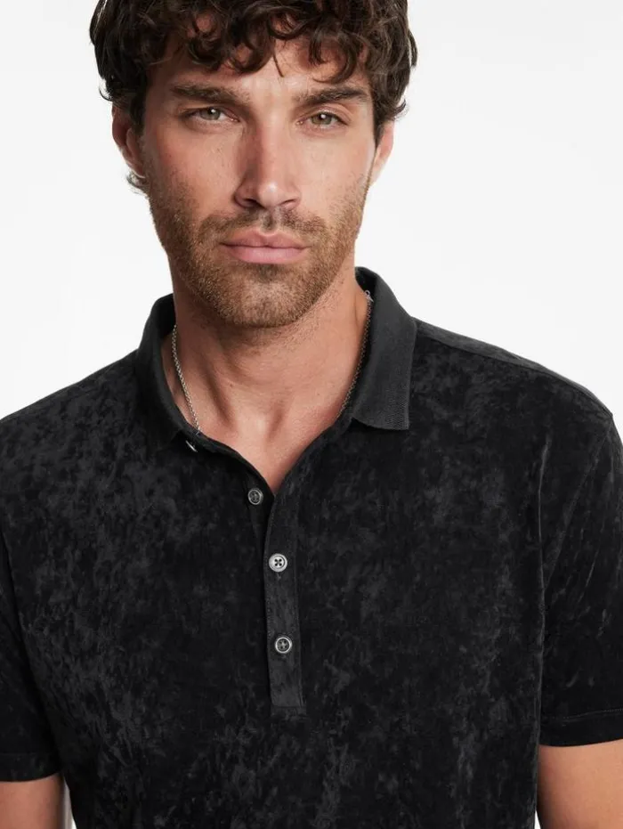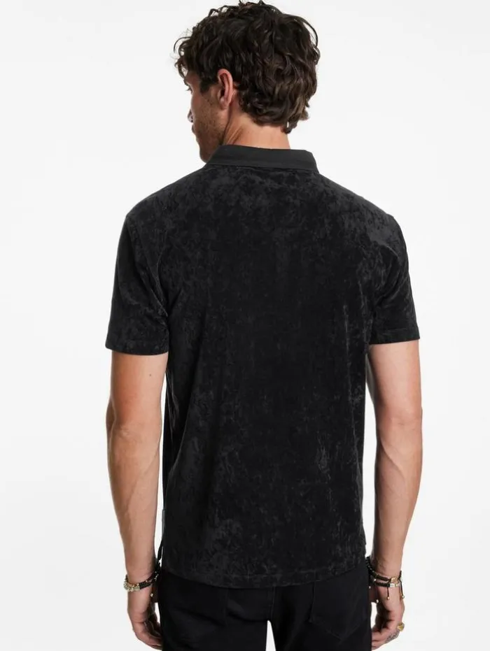 Casual dressing takes a bold turn with the Torres Polo this season. Luxuriously soft to the touch, this piece redefines everyday style with its velvet-like texture and sophisticated ribbed collar, elegantly adorned with sweater trim. Antique brushed metal buttons finish the look with a hint of nostalgia. Effortlessly stylish, this polo does the heavy lifting; pair it with jeans and a long-lined coat for an ensemble that stands out.66% Triacetate, 25% Polyester, 9% PolyurethaneDry cleanRibbed collarShort sleeveRegular fitAntique brushed metal buttonsHigh low matte velvet textureSeam detail at button placketMeasurements: Body Length: 27.5”, Shoulder Width: 18”, Chest Width: 20.25”, Sleeve Length: 34.75”