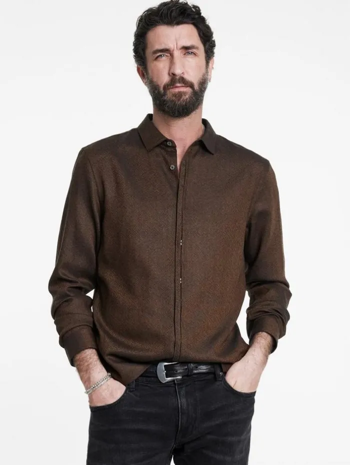 The Hickory Shirt turns understated design on its head with a fresh perspective that challenges convention. Crafted from virgin wool gauze and meticulously finished in a tumbler, this shirt offers a supremely soft texture that elevates everyday comfort. Its concealed button placket and neatly pleated details introduce a refined edge to the relaxed silhouette, blending traditional shirt elements with a modern twist.100% WoolDry Clean OnlyCollarLong SleeveConcealed Button PlacketTumbler FinishedMeasurements: Body Length: 72cm, Chest (Flat): 54cm, Sleeve Length: 65cm, Neck Circumference: 43cm