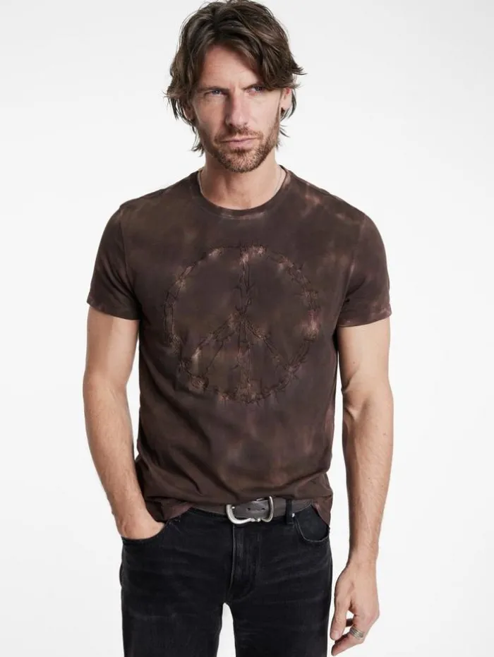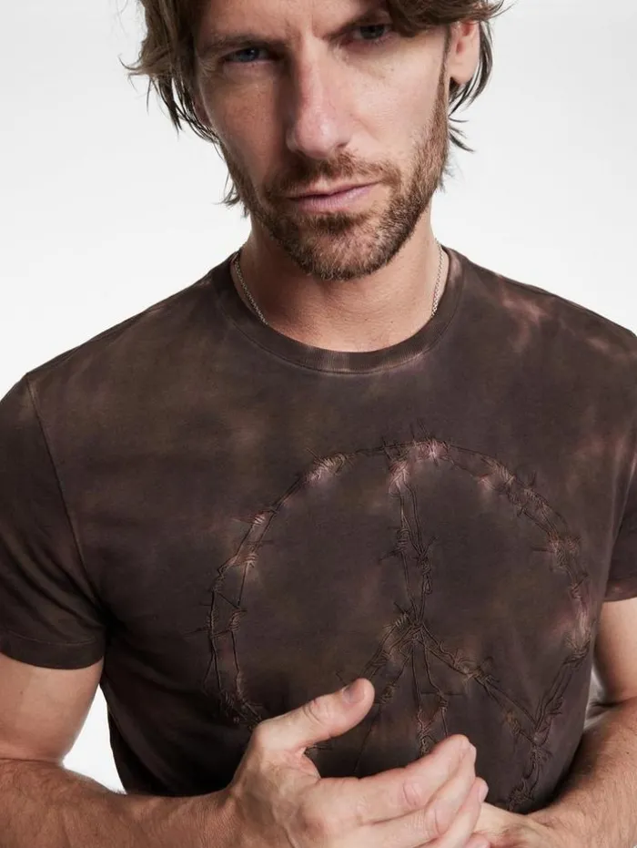 Make a bold statement with our Ink Peace Tee, a standout in casual wear. This short sleeve tee showcases striking barbed wire peace artwork, meticulously crafted with satin stitch embroidery. The t-shirt, including its embroidery, undergoes a tie-dye process, creating a distinctive effect as the dye interacts variably across different areas. This innovative approach results in a one-of-a-kind pattern, transforming each shirt into a piece of wearable art.100% Cotton Machine Wash ColdCrewneckShort SleeveTie-Dye ProcessBarbed Wire Peace Artwork With Satin Stitch EmbroideryMeasurements: Body Length: 28″, Chest Width (Flat): 20.5”, Shoulder Width: 18”, Sleeve Length: 16.75″