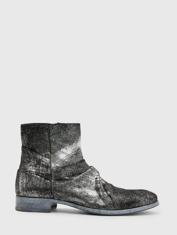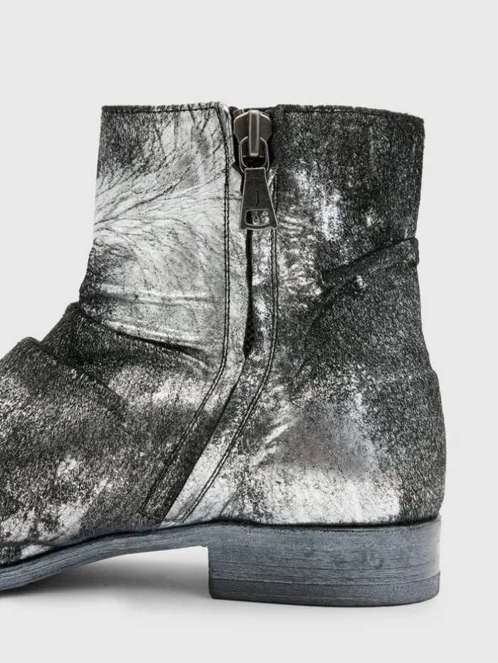 Resort ’24 unveils the Morrison Sharpei Boot, an iconic style reimagined in unique silver foil-sprayed calf hair. This Italian-made boot boasts luxuriously full calf lining and a medial zipper for easy wear, while the hand-stained leather sole and stacked leather heel underscore its premium construction. Upper: 100% Genuine LeatherSole: 100% Genuine LeatherProfessional care by leather expertMedial zip closureFull calf liningSilver foil sprayed calf hairHandstained leather soleStacked leather heelMade in Italy