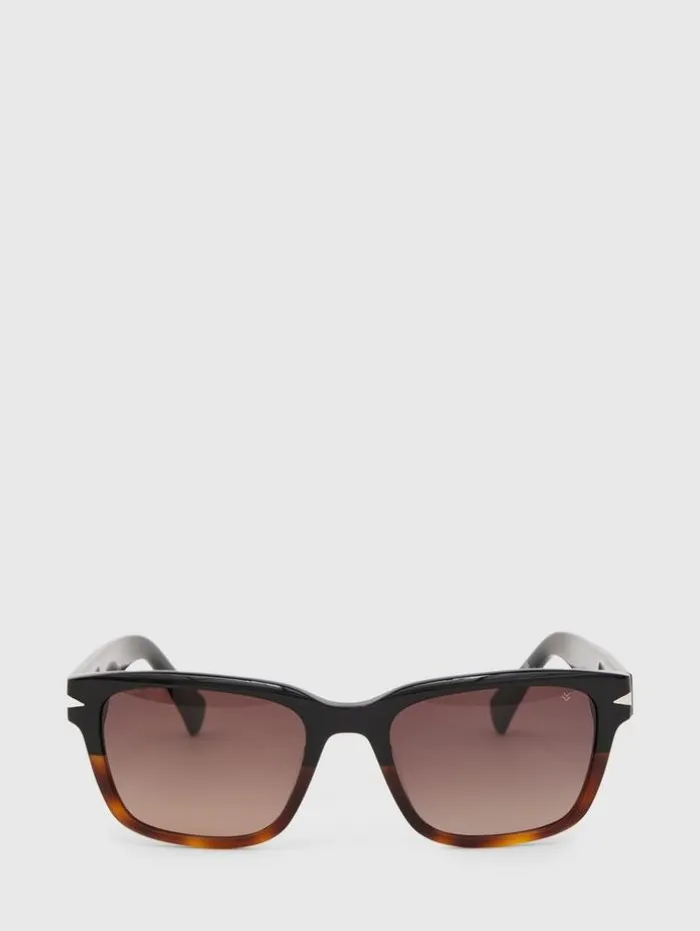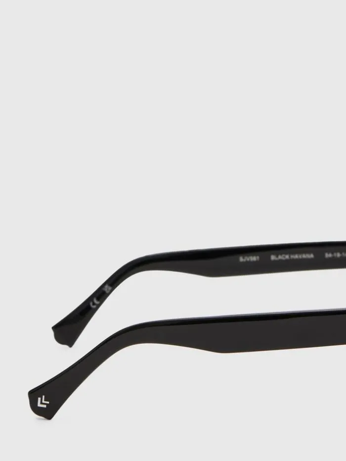 The high-quality acetate on a modern take on a traditional rectangular style is what sets this frame apart, and gives it a rock and roll look. The wide temple arms showcase a double V pattern standing for John Varvatos. The frame comes in three distinct colors, black Havana, cream Havana, and crystal blue. Each frame has a lens in a complementary color and has a special AR blue black coating for additional eye protection.