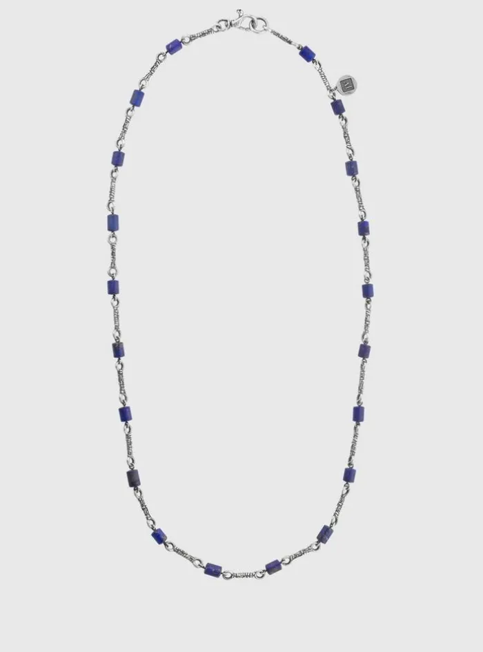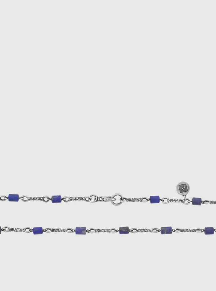 Jewelry with attitude – this necklace is crafted from sterling silver. Detailed with precious lapis beads with woven links inbetween.. Sterling SilverLength: 24.5″Lobster Clasp ClosureStationPrimary Stone: LapisHandcrafted in Istanbul