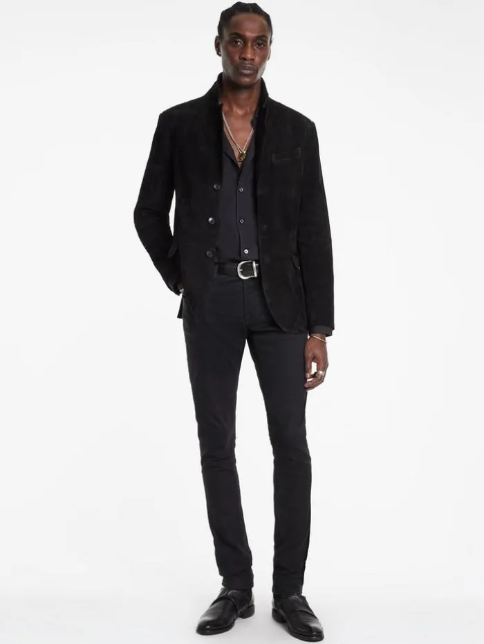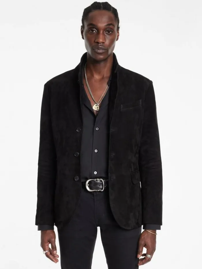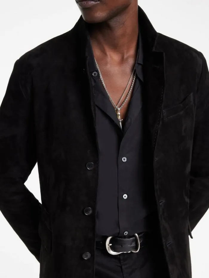Each thread of our Rind Jacket narrates a tale of classic luxury and exceptional craftsmanship. Expertly crafted from the finest goat suede, this jacket features a classic silhouette enhanced by a refined notch lapel, lending a touch of traditional charm. Its functional flap hip pockets enhance its practicality contributing to its sleek, modern profile. Draped in the Rind, you embody the essence of modern elegance, where every detail is a nod to both past and present.100% Goat SuedeLining: 100% CuproProfessional Dry Clean by Leather Expert Three Button ClosureNotch LapelLong SleeveSlim FitSingle BreastFlap Hip PocketMeasurements: Front Body Length: 30cm, Center Back Body Length: 29cm, Across Shoulder: 18.5cm, Chest: 20.625cm Flat, Sleeve Length: 26.25cm