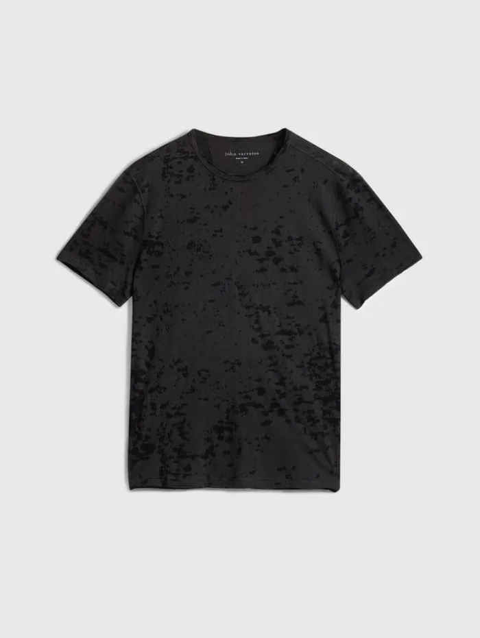Every detail in our Eden Burnout Crew speaks volumes. Slip on this organic cotton blend tee for effortless cool. Its burnout pattern weaves through the fabric, enhanced by seams highlighted with vertical pickstitching. Its timeless silhouette features a side slit for exceptional comfort, while raw edge trims along the neck, cuffs, and hem infuse a rugged touch. Our signature flag label on the side marks its authenticity and quality craftsmanship.60% Organic Cotton, 40% PolyesterMachine Wash ColdCrew NeckPulloverShort SleeveRaw Edge DetailSignature Flag LabelMeasurements: Body Length: 27.5″, Chest Width (Flat): 20.5″, Sleeve Length: 17.5″