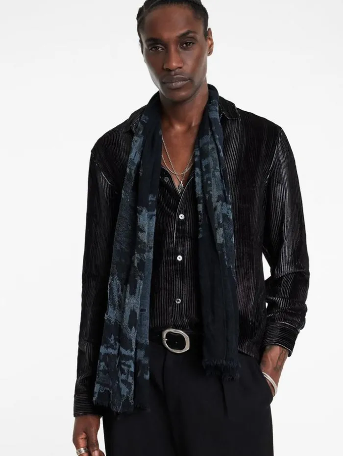 Featuring an abstract distressed pattern in a luxe crinkled Italian fabric, the Reno Scarf, cast in a sleek carbon grey base, delivers a unique edge with its multi-color jacquard pattern. Draped or wrapped—this piece is an essential accessory for any modern wardrobe. 51% Viscose, 49% WoolDry Clean OnlyMulti-Color Jacquard PatternMade in Italy