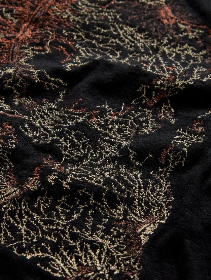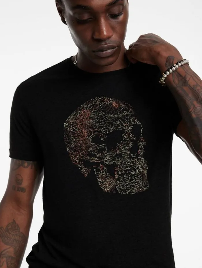 A statement tee for weekend looks, this piece is crafted from a soft linen and modal blend, balancing comfort with character. It features an intricate skull motif, embroidered artfully with a spectrum of multi-colored threads and subtle metallic accents. A soon-to-be favorite in your wardrobe, pair it with our Ethan Wash jeans and low-top sneakers for a relaxed yet refined appearance that transitions effortlessly from day to night.55% Linen, 45% Modal Machine wash coldCrewneckShort sleeveSkull artworkMulti-colored embroideryMeasurements: Body Length: 27.5″, Chest Width: 20.5”, Shoulder Width: 18”, Sleeve Length: 16.75″