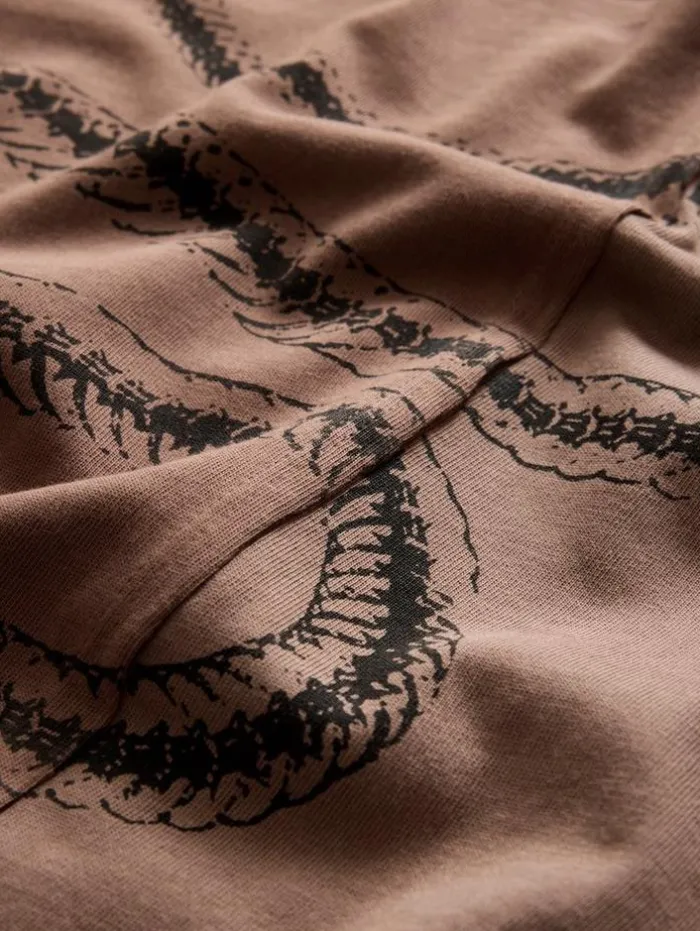Some snakes are meant to be seen – our Snake Bones Tee is one of them, combining raw edge seams with comfortable organic cotton construction. The snake skeleton design printed across the seams delivers a strong visual impact with a vintage allure. Throw it on with your trusted jeans and a jacket for a look that refuses to lurk in the shadows.100% Organic CottonMachine Wash ColdCrew NeckShort SleeveRaw Edge DetailSnake Skeleton ArtworkMeasurements: Body Length: 28″, Chest Width (Flat): 20.5″, Sleeve Length: 16.75″
