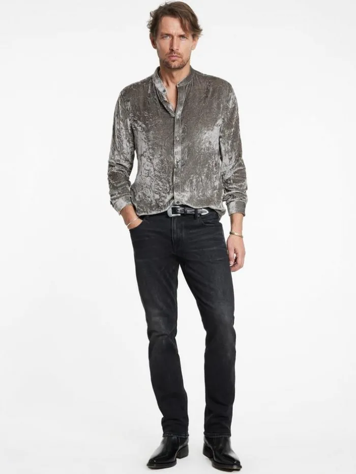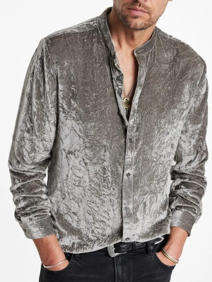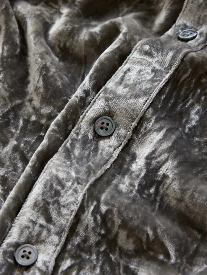 Immersed in a bold smoky pearl grey hue, the Vigo Shirt captivates with its fluid velvet composition, crafted with silk chiffon at the base and a viscose pile that’s both rounded and soft. This slim-fit shirt features a modern band collar and precise back side darts, sculpting a refined silhouette. The unique wrinkled surface, achieved through a specialized crushing mechanism, enhances the velvet’s three-dimensional effect and dynamic interplay of color and light. This method creates an ever-changing visual spectacle that perfectly embodies the spirit of our Renascence collection.80% Viscose, 20% SilkDry Clean OnlyLong SleeveButton Front ClosureWrinkled EffectMeasurements: Body Length: 76cm, Chest (Flat): 54.5cm, Sleeve Length: 65cm, Neck Circumference: 45cm