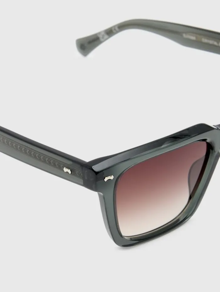 Inspired by the vibrant world of music, our Wooster Square Sunglasses echo the distinctive features of a guitar headstock, with rivets accentuating the temple head and front endpiece. These sage frames, a testament to our dedication to artistry, are crafted from acetate, boasting elaborate detailing that elevates the design. The brown gradient lenses, enhanced with a special AR blue back coating offer both unique style and additional eye protection.Frame Material: AcetateLens Color: Brown GradientGuitar Headstock inspired RivetsAR Blue Back Coating