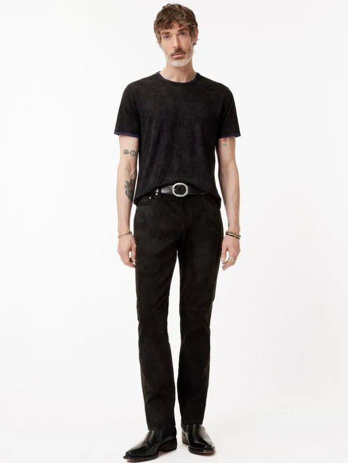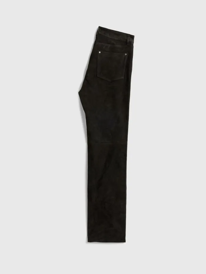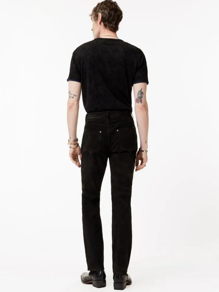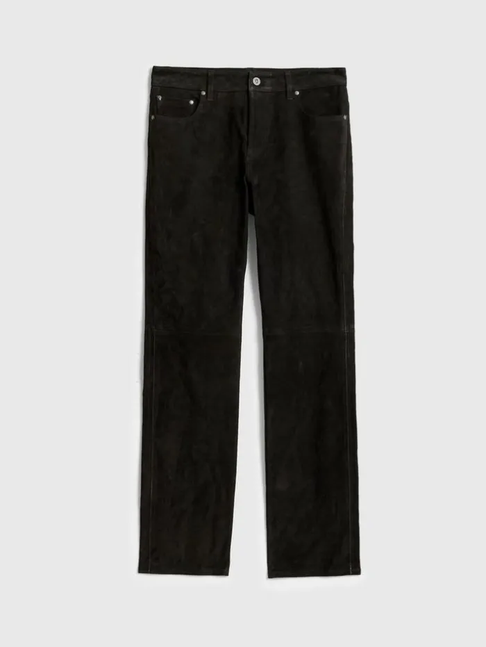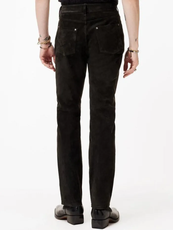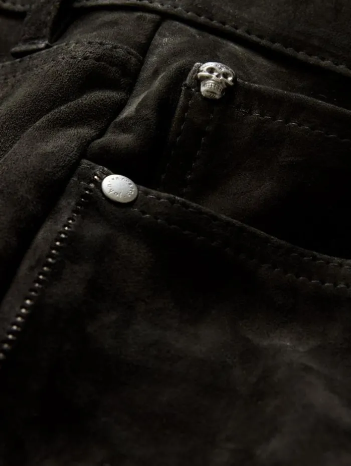 Five-pocket pants crafted from supple lamb suede blend versatility with an edge. Notable ball and chain detailing along the side seams inject a rebellious touch into this regular-fit design, pairing seamlessly with casual and formal wear.100% Lamb SuedeProfessional dry clean by leather expertSkinny fitFive pocketsZip and button closureBall and chain detailingMeasurement: Waist: “, Hip: 41”, Inseam: 32”
