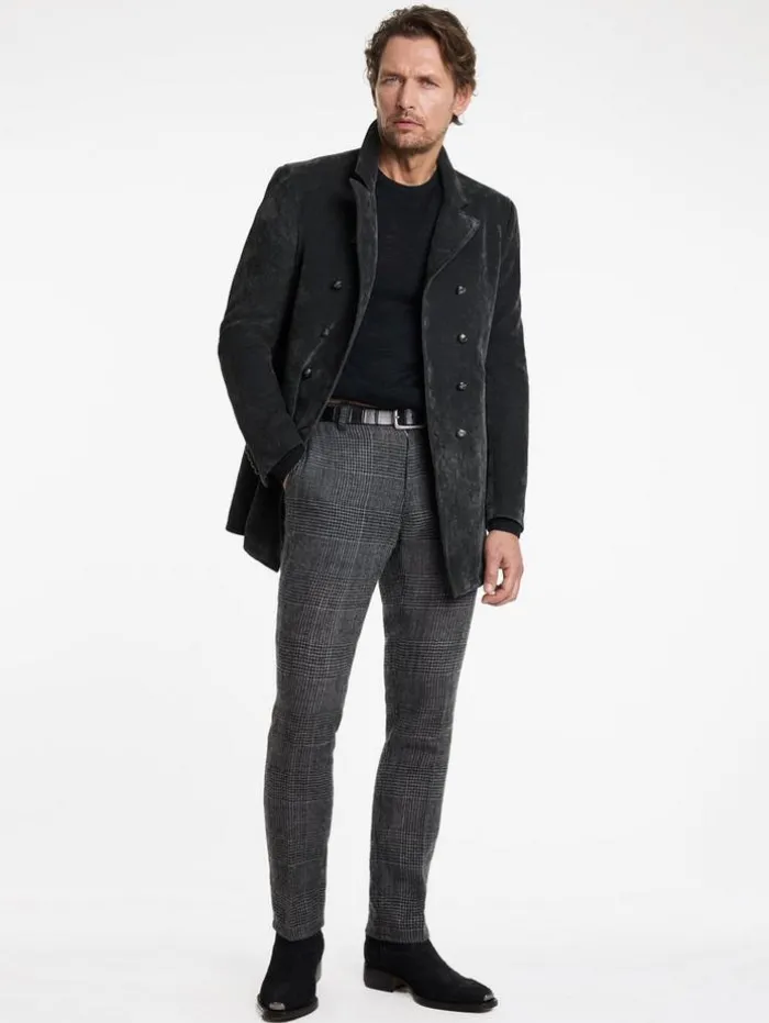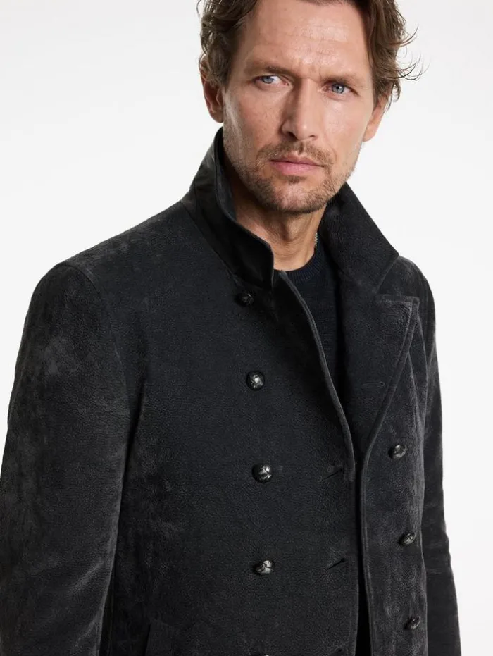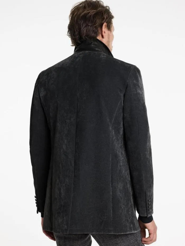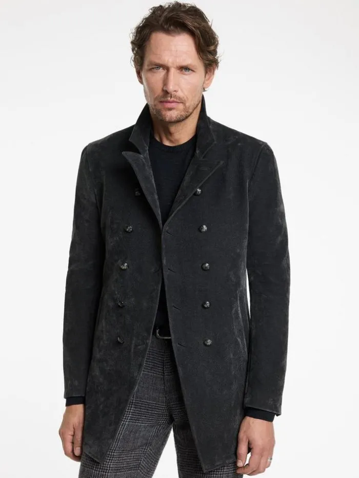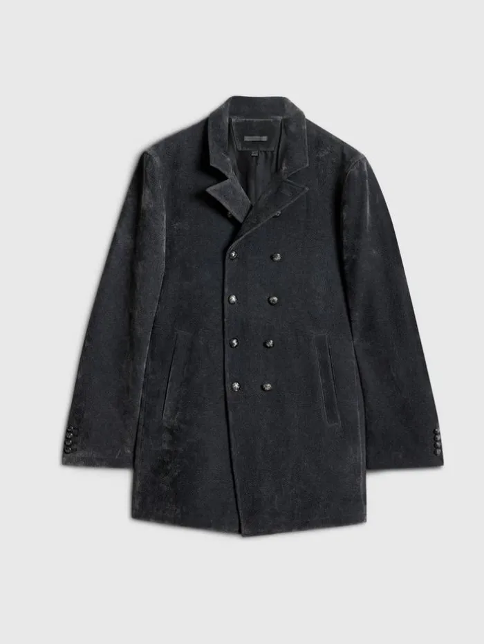 Timelessly constructed, the Regan Coat is a classic reimagined for modern dressing. Crafted in Italy from a fine cotton blend, this double-breasted coat is dyed in a deep charcoal hue. Enhanced with colored viscose fibers, it boasts a richly textured, flocked finish that lends both movement and compactness to the material. A special after-treatment imparts a lustrous, hammered effect, deepening the design’s sophistication. With its mid-length cut and metal multi-button front, the Regan is as versatile as it is stylish. Don it over a suit or pair it with casual layers for a look that captures the rarified sophistication of JV.50% Cotton, 50% ViscoseDry Clean OnlyDouble-BreastedMulti-Button ClosureWelt PocketsFlocked FinishMade in ItalyMeasurements: Body Length: 89cm, Chest Width (Flat): 54.5cm, Shoulder Width: 48cm, Sleeve Length: 66cm