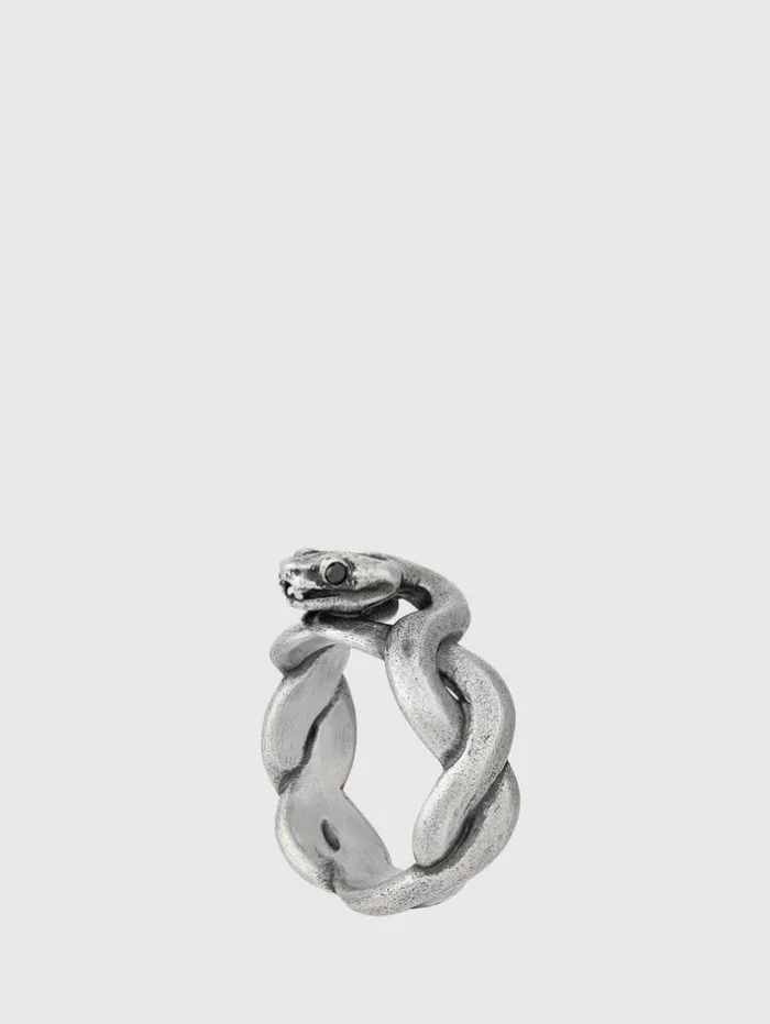 The Snakeskin Band Ring builds on our return to rarified design this season. Handcrafted in Istanbul, the ring features a coiled serpent motif, its intricate form wrapping around your finger, symbolizing eternal strength and protection. The weathered texture and piercing black diamond eye reflect the fierce elegance of the snake, delivering a look that’s as powerful as it is refined. Wear it solo for a statement that stands on its own, or stack it against our other Fall ’24 rings to create a look that is distinctively yours. Sterling SilverBand Width: 10 mmHeight Off Finger: 6.88 mmSnake MotifBlack Diamond EyeHandcrafted in Turkey