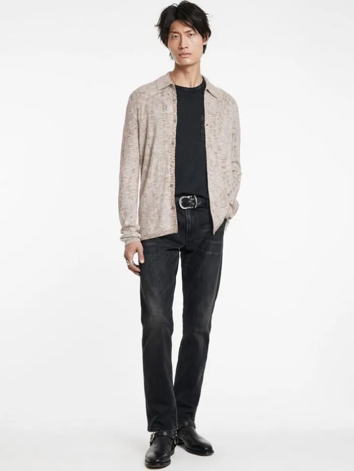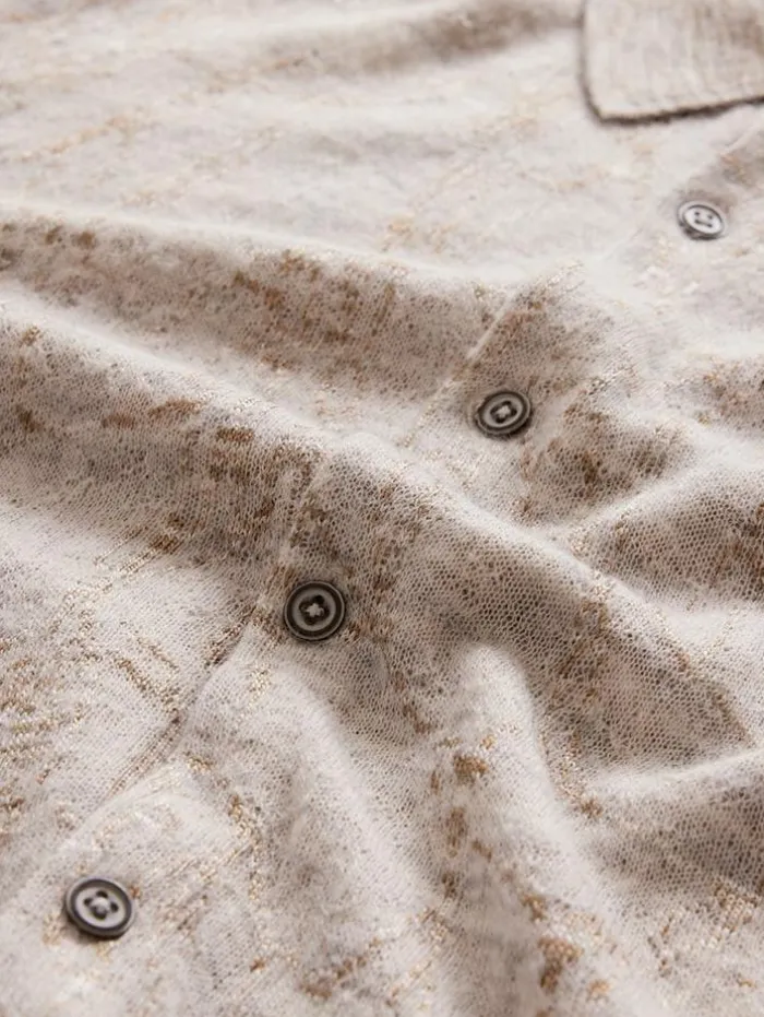 The Caravaggio Shirt showcases skillful knitwear artistry, rendered in a cracked marble jacquard that weaves together mohair with multicolored yarns for a textured, dimensional appearance. This regular fit, long-sleeved shirt is a canvas of sophistication, showcasing a subtle snow heather color palette that echoes the intricate nuances of aged marble. Antiqued metal buttons add a touch of historical depth, enhancing its overall antique charm. Perfect for discerning wardrobes that value craftsmanship, the Caravaggio is a testament to luxurious detailing and must be hand-washed to maintain its artisan quality.52% Polyamide, 27% Super Kid Mohair, 21% Extrafine MerinoHand Wash OnlyRegular FitAntiqued Button Front Closure Long SleeveCracked Marble JacquardMeasurements: Body Length: 27”, Chest (Flat): 21”, Sleeve Length: 34.25