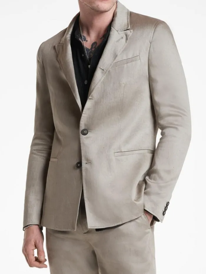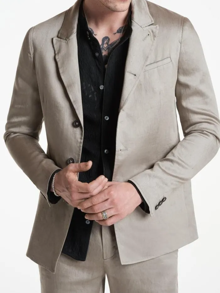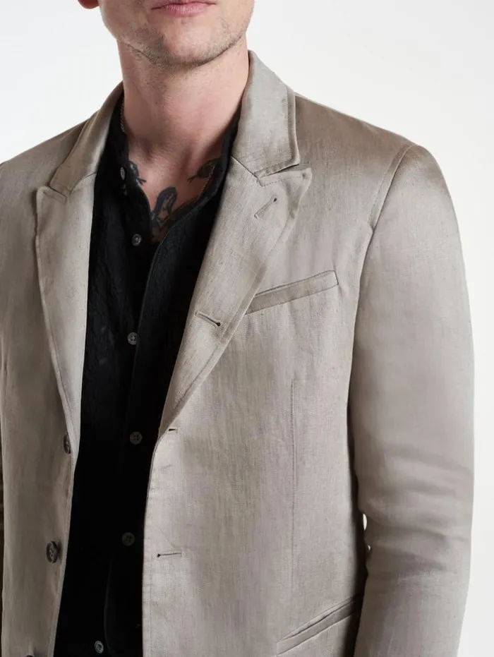 The Gido Jacket is the perfect addition to our soft collection. This wardrobe essential is crafted from a silky, Italian linen. It’s shaped to a dropped neck peak lapel structure. Summer suiting has never looked better. 100% LinenDry Clean OnlyButton ClosureDropped Neck Peak LapelLong SleevesSilky Soft TextureItalian Fabric