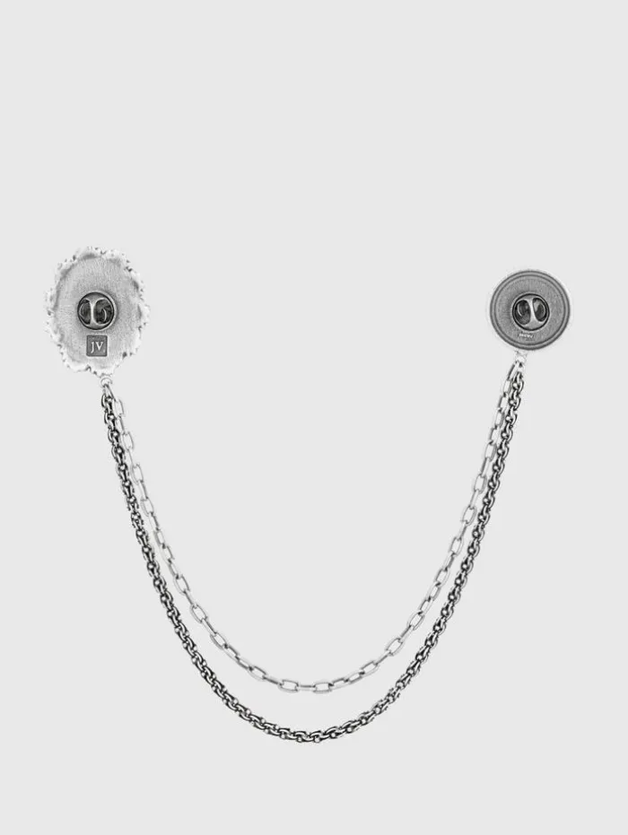 Elevate your John Varvatos suiting with our Link Pin. This lapel brooch features intricate floral motifs, encapsulated in a round sterling silver setting alongside an oval Tiger’s Eye stone, showcasing rich, natural hues. A finely crafted sterling silver chain connects these elegant elements, providing a sophisticated yet bold accent to any ensemble. Sterling SilverTiger Eye StoneLength: 8.50 inchesPendant: 41.0×29.50 mm-29.0×24.50 mmLink PinRound and Oval Floral MotifHandcrafted in Turkey