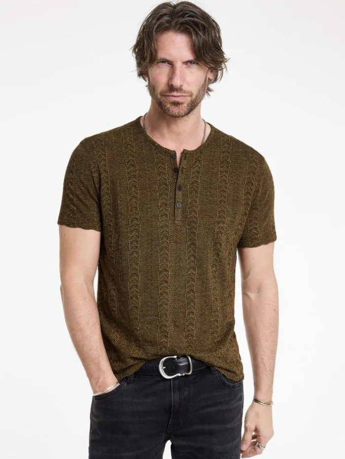 Expertly designed, the Madoc Henley exudes bold character without sacrificing comfort. This piece is intricately woven from three distinct color yarns into a textured jacquard fabric, creating striking visual depth. This henley features a four-button central front placket that lends a touch of refinement, while a discreet flag label on the side underscores our commitment to quality. It effortlessly complements both denim or casual pants, enhancing any ensemble with its understated luxury.50% Viscose, 30% Polyester, 20% Organic CottonMachine Wash ColdShort SleeveFour-Button PlacketTextured Jacquard FabricJV Flag LabelMeasurements: Body Length: 27.5″, Chest Width (Flat): 20.5″, Sleeve Length: 17.5″