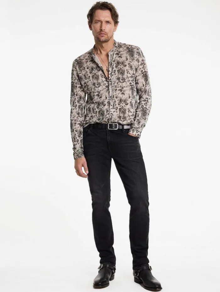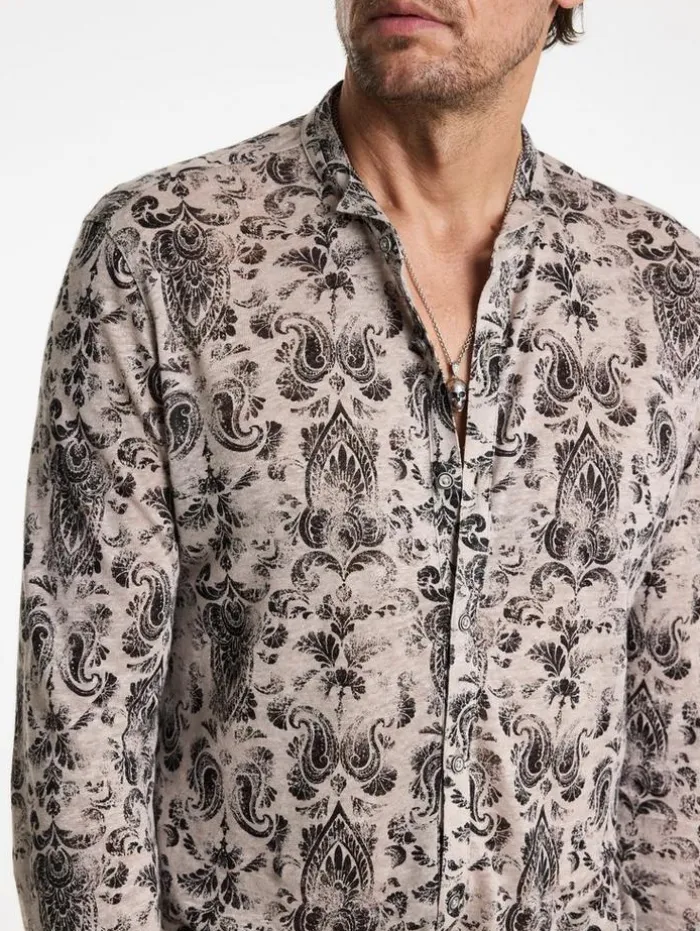 The paisley print enlivens our Padria Shirt, crafting a sophisticated narrative with every thread. Rendered in a seal grey palette and made from linen, this regular-fit long-sleeve shirt boasts a breathable, subtly textured fabric that combines comfort with style. The distinctive wingtip collar and antiqued metal buttons inject a touch of vintage elegance, forging a look that’s both timeless and contemporary. Finished with a classic shirt tail hem, the Padria Shirt is a must-have for a sophisticated autumn wardrobe.100% LinenHand Wash ColdRegular-FitLong SleeveWingtip CollarAntiqued Metal Button ClosurePaisley PrintTail Hem FinishMeasurements: Body Length: 28.5″, Chest Width (Flat): 21.25″, Sleeve Length: 34.75″