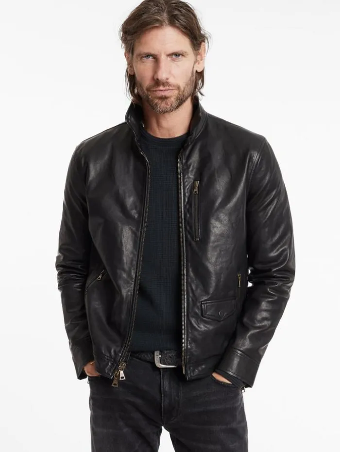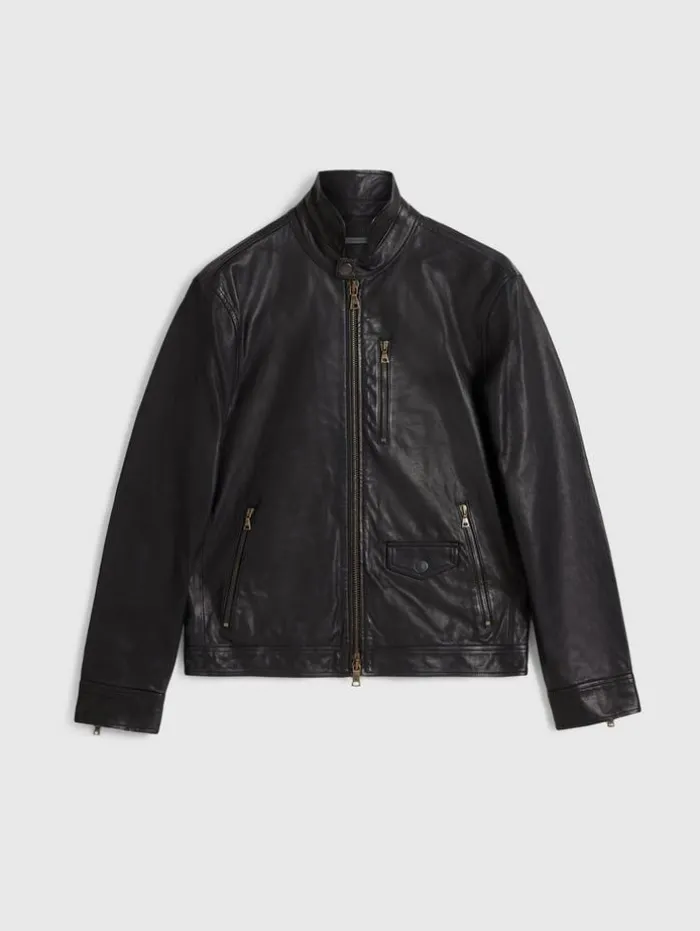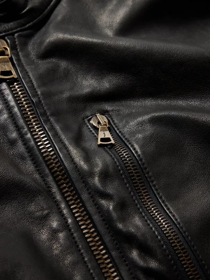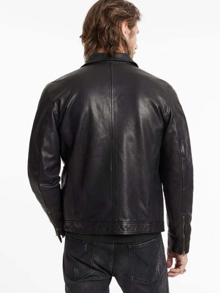 Ease into winter styling with the York Jacket. A simple leather silhouette with refined finishes. It has a wire collar for added structure and the leather’s been burnished for a slightly worn-in feel. The vintage look is complemented by brass hardware for a fully authentic aesthetic.100% Goat LeatherLining: 100% Cupro Vertical Zipped Chest PocketDual Zip Side PocketsWire Inserted Collar With Snap ClosureSnap CuffsDual Zip Front Closure