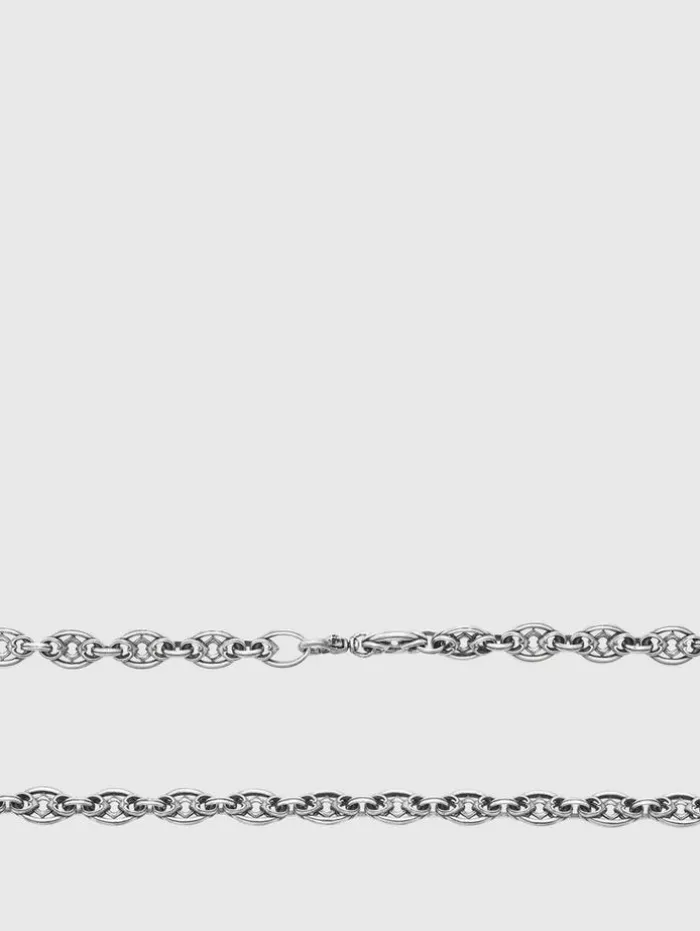 An emblem of dark excellence – this necklace features a series of interconnected oval links that delivers an antiqued aesthetic. At 24-inches, this necklace serves as a captivating focal point, perfect as a statement piece to enhance any ensemble. Pair it with the matching Link Bracelet for a complete look. Sterling SilverLobster Clasp All-Around Links Length: 24 in. Width: 10.0 mm Handcrafted in Istanbul
