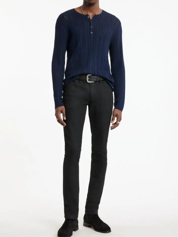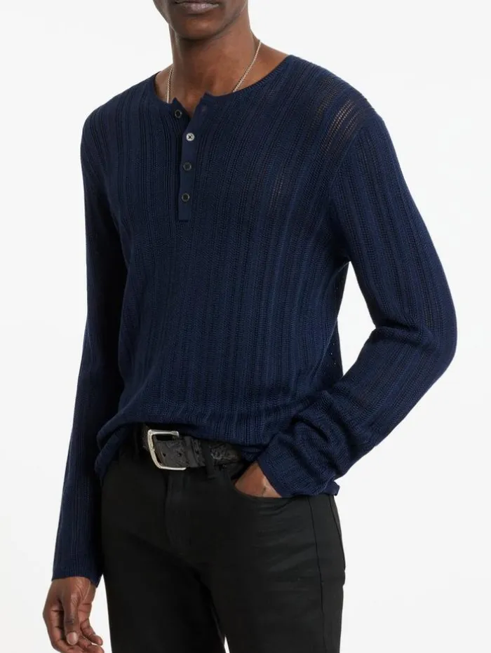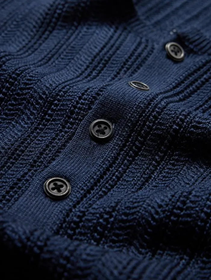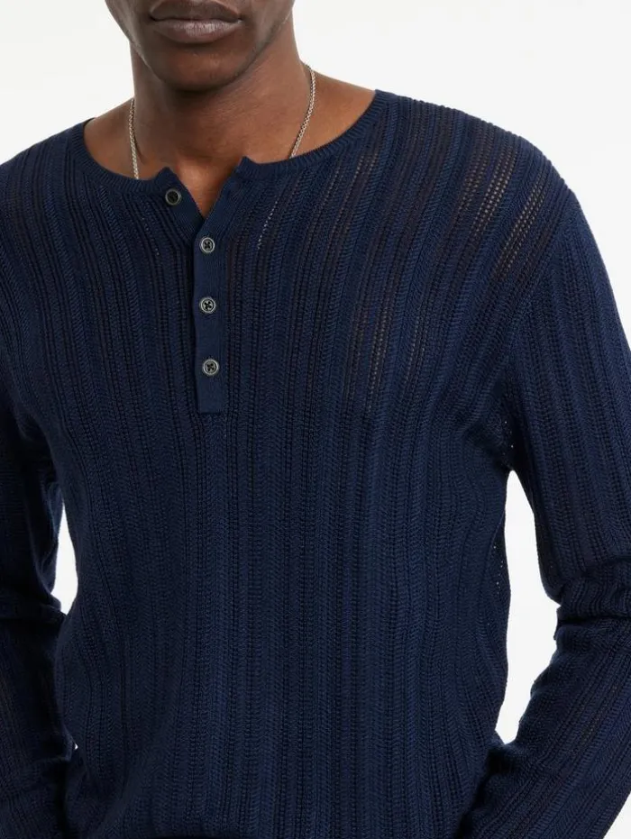 The Salete Henley is a heritage style brought up to date. Merino wool and silk are blended together to create a soft lightweight material that has been delicately woven into a open textured stitch – it retains its traditional details, but with an elevated modern feel.70% Merino Wool, 30% SilkHand Wash ColdHenley Button NeckPulloverLong SleeveTextured Open StitchMeasurements: Front Body Length: 26.5″, Chest: 19″, Across Shoulder: 16.5″, Flat Sleeve Length : 34″