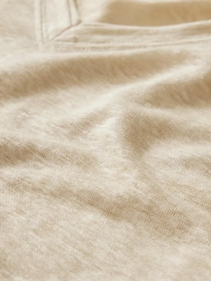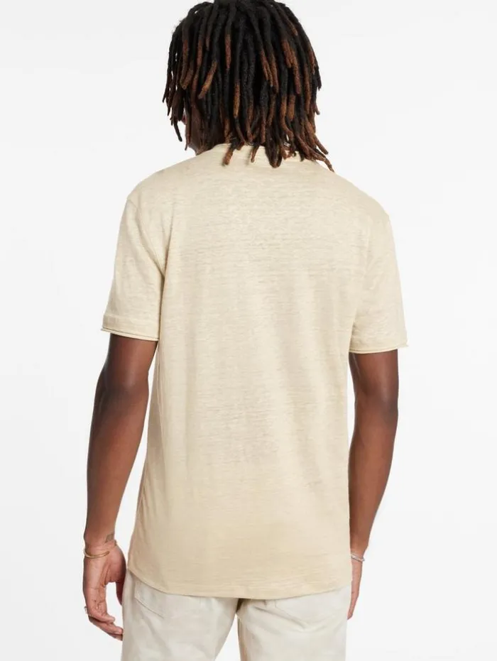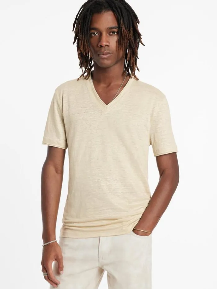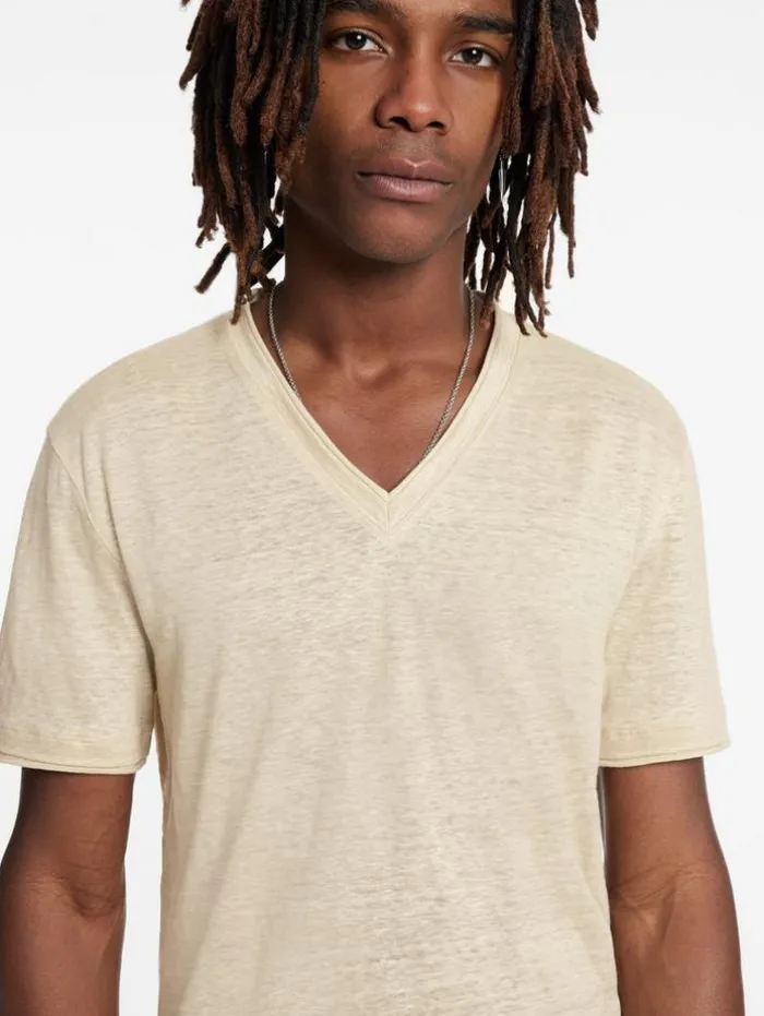 Redefine casual sophistication with our Wooster V-Neck. This slim-fit, short sleeve linen tee offers a fresh take on everyday attire. Crafted from mercerized linen, it boasts a refined V-neck silhouette with raw edge detailing at the cuffs and neckline. The perfect casual piece, the Wooster pairs seamlessly with jeans under your favorite leather jacket. Elevate your wardrobe with this essential tee.100% Linen Hand Wash ColdV-NeckPulloverShort SleeveRaw Edge DetailingMeasurements: Body Length: 27.5″, Chest Width (Flat): 20”, Shoulder Width: 18.5″, Sleeve Length: 17.5″