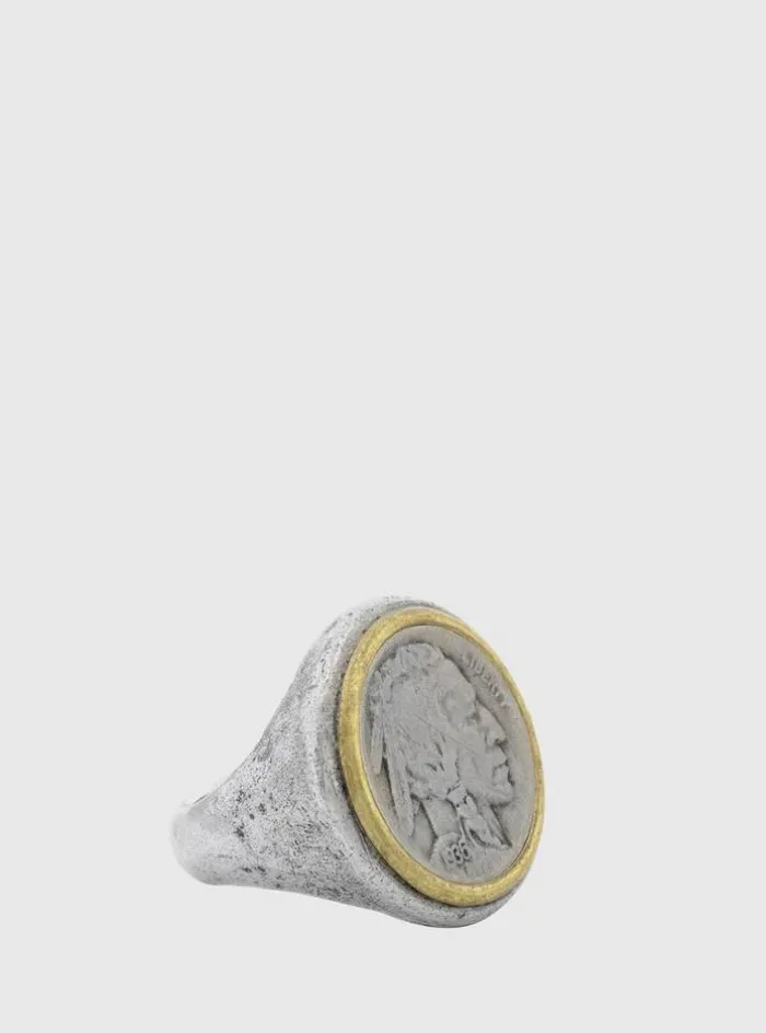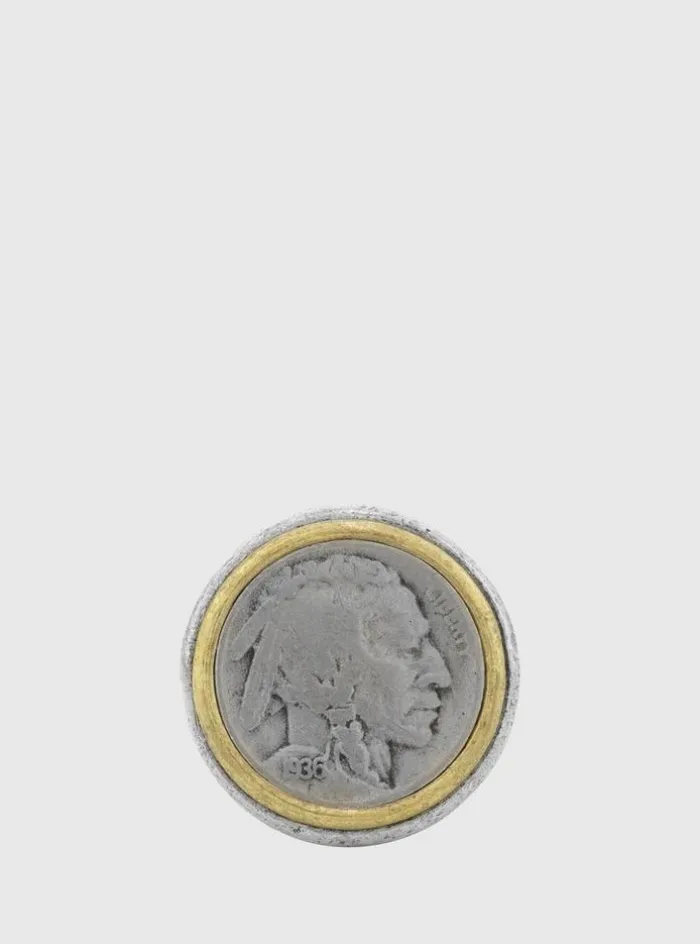 Jewelry with attitude – this ring is crafted from sterling silver and brass. Detailed with a distressed finish. Brass/Sterling SilverSize 10Metal featurePrimary Stone: CoinHandcrafted in Istanbul