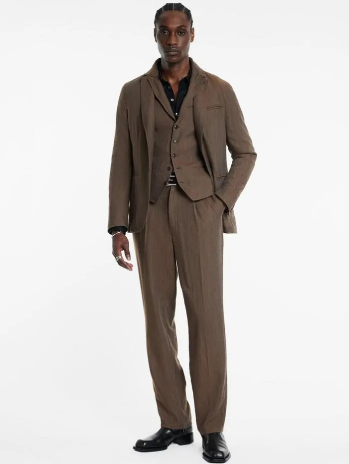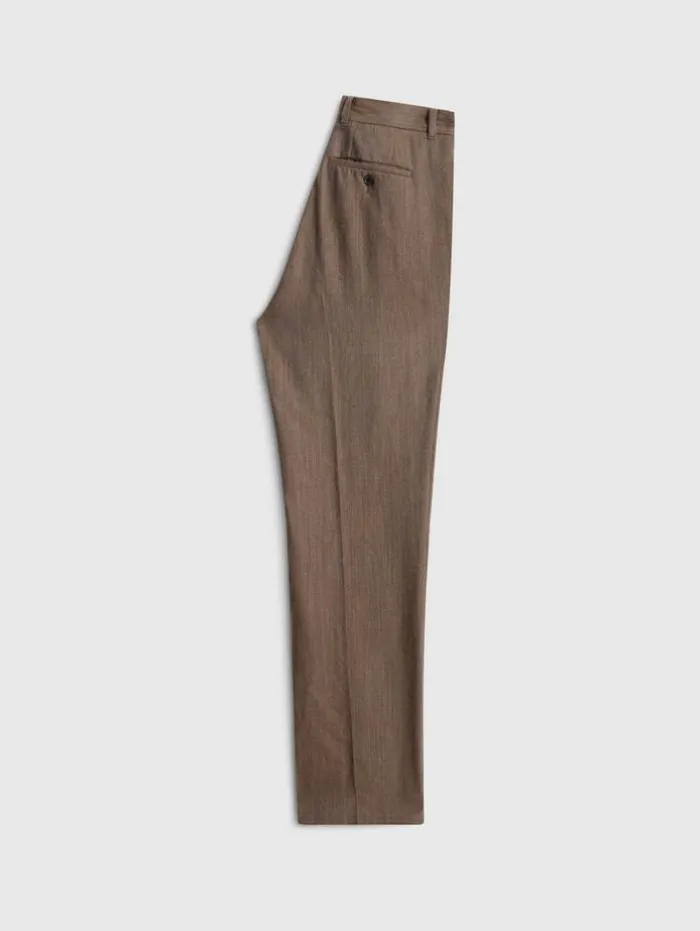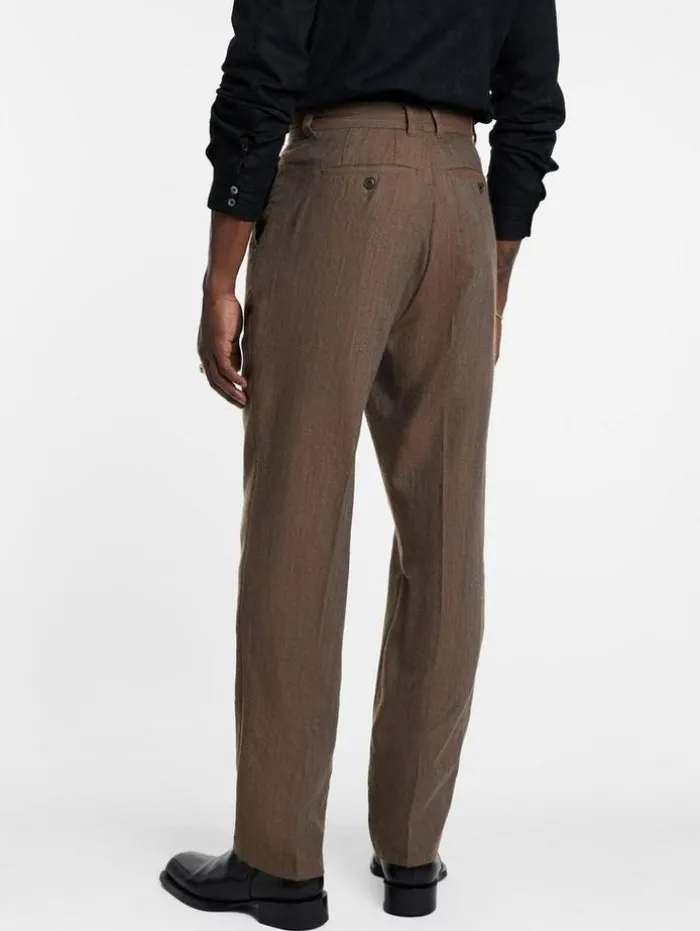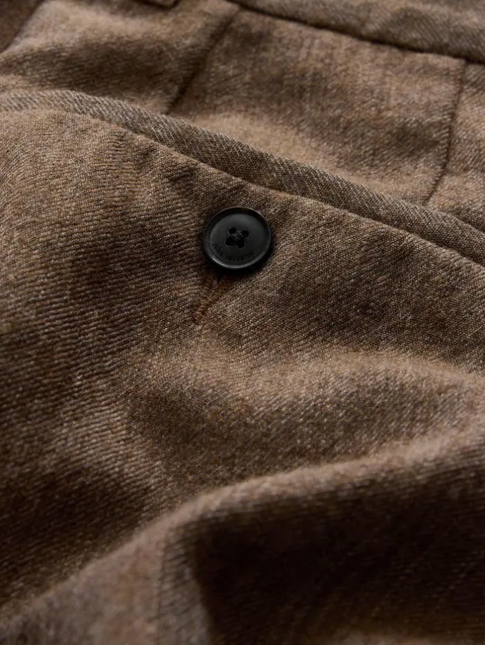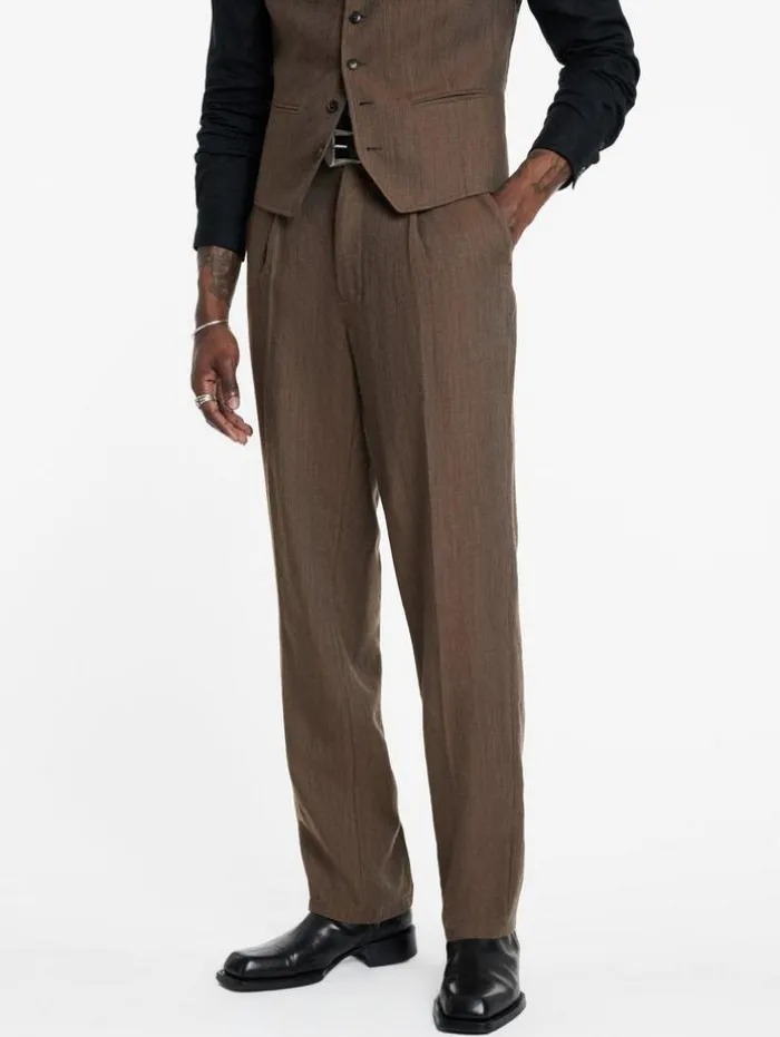 Our Benedict Pants bring sharp pleats to the forefront, now reimagined in a herringbone tweed that transitions effortlessly across style spectrums. These slim-fit pants are crafted from a light and spare herringbone tweed with an open and slightly transparent weft, offering a look that’s both sophisticated and daring. The tweed’s inherent softness ensures a wrinkle-free appearance, perfect for maintaining a polished look throughout the day. Moreover, these pants undergo a special “wavy” finishing process before being crushed, adding a distinctive texture and dynamic flair that underscores their unique appeal.100% WoolSlim FitZipper FlyPleated DetailingMeasurements: Waist: 85cm, Hip: 114cm, Inseam: 80cm