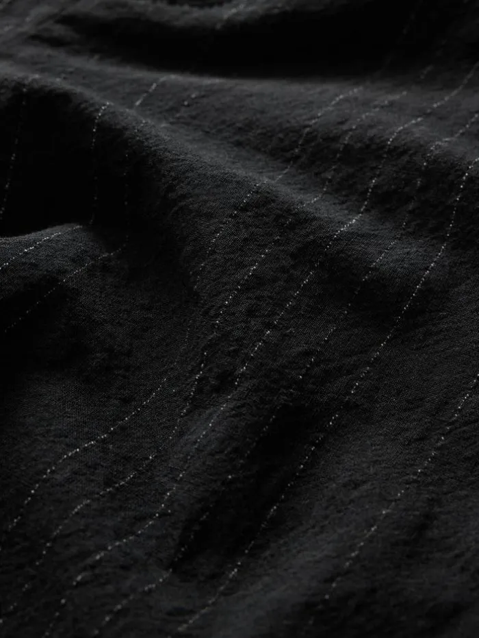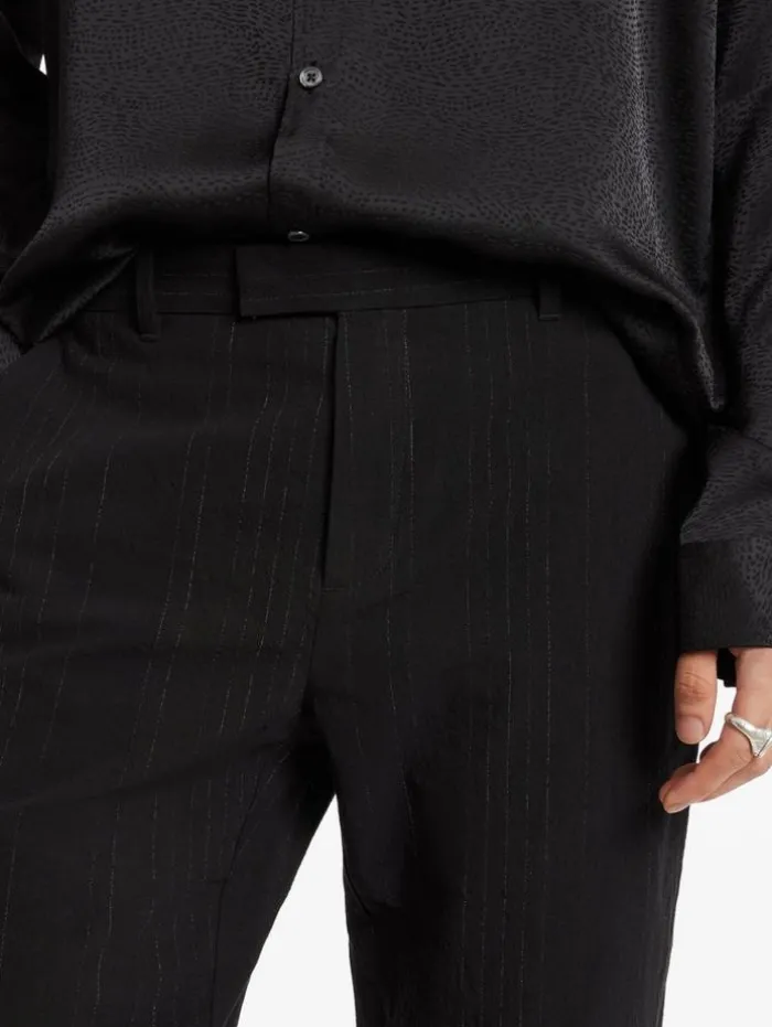 Expertly tailored for a slim fit, our Mercer Pants are a modern classic, featuring welt hip pockets and an extended waistband that perfectly balance comfort with a sleek silhouette. Crafted from premium Italian fabric, they boast a sophisticated pin stripe pattern, adding a touch of timeless elegance to your look. The precise tailoring ensures a flattering fit, making these pants ideal for both formal and casual occasions. Their distinctive pinstripe design sets them apart, offering a suave, polished appearance for a discerning ensemble. 70% Cotton, 21% Linen, 2% Wool Dry Clean Only Slim Zipper Fly Extended WaistbandWelt Hip PocketsPinstripe PatternItalian FabricMeasurements: Waist: 17″, Inseam: 32″, Leg Opening: 7.25″