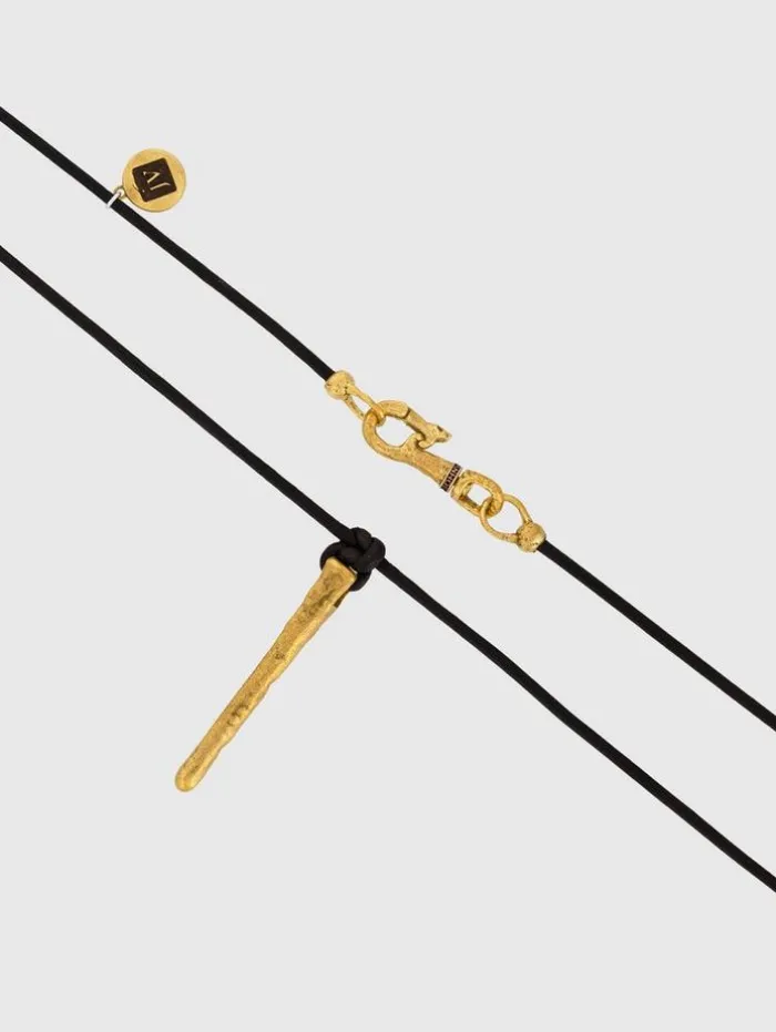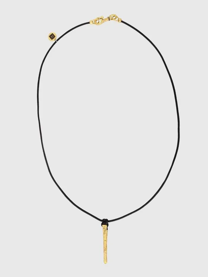 Brass accents distinguish John Varvatos’ Fall Collection with a touch of industrial charm. The uniquely chiseled, nail-shaped pendant, hand-finished for an aged appearance, stands out against a resilient black leather cord, enhancing its rich, golden sheen. Completed with a clasp closure, this piece adds a sophisticated finish to any ensemble. BrassLength: 24 inchesPendant: 49.0×7.50 mmCord Width: 1.85mmLeather CordHandcrafted in Turkey