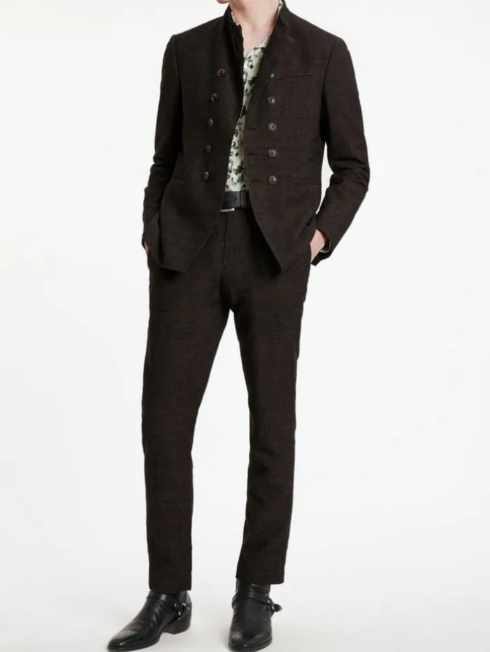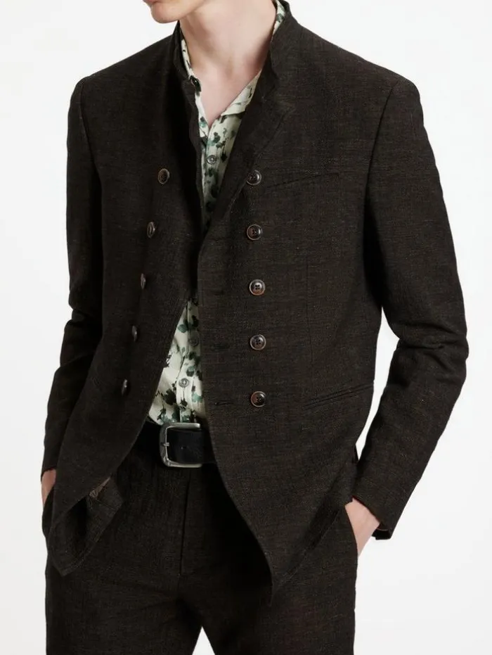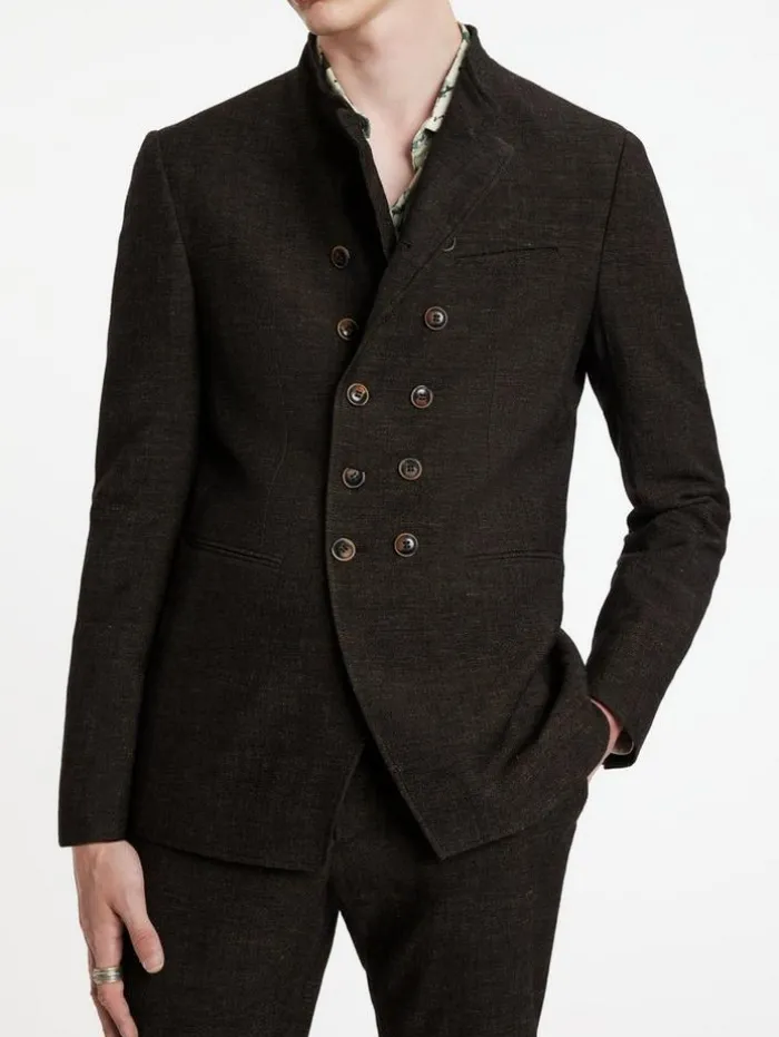 Elegant touches take miltary aesthetics to a new level. The Upson Jacket is made from a luxury wool-linen blend fabric. The double breasted silhouette features a wire inserted collar and multiple buttons. 75% Wool, 25% Linen Dry Clean OnlyHook and Bar ClosureCollarSlim FitLong SleevesDouble BreastedWire Stand Up CollarMeasurements: Front Body Length: 79.5cm, Center Back Body Length: 73.5cm, Across Shoulder: 47.5cm, Chest: 54cm, Sleeve Length: 66cm