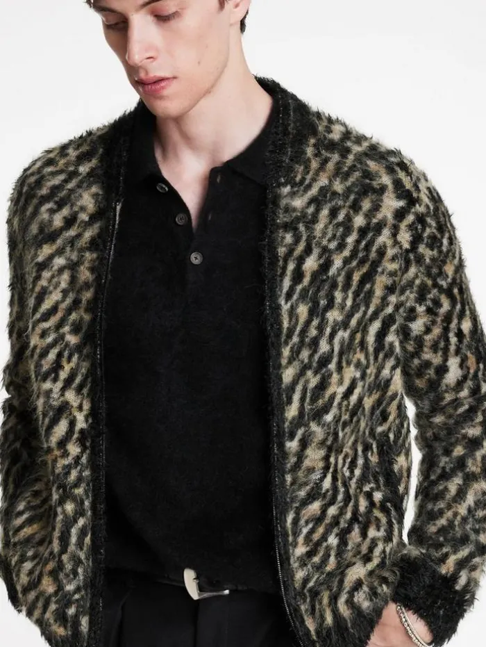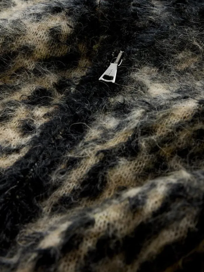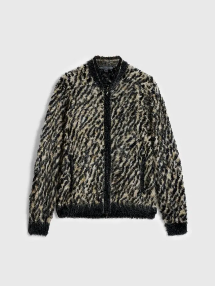 The wild side of luxury presents itself in the Camino Bomber. Flaunting a textured zebra jacquard, this jacket is expertly crafted from a blend of silky fur yarns, combining extrafine merino with superkid mohair for unparalleled softness and warmth. Finished with a sleek gunmetal zipper, this bomber provides the perfect edge for memorable nights out on the town.100% Polyamide + 50% Superkid Mohair, 20% Extrafine Merino, 30% PolyamideDry Clean OnlyRegular FitGunmetal Zip ClosureZebra Jacquard PatternMeasurements: Body Length: 26.5”, Chest Width (Flat): 20.5″, Sleeve Length: 34.5”