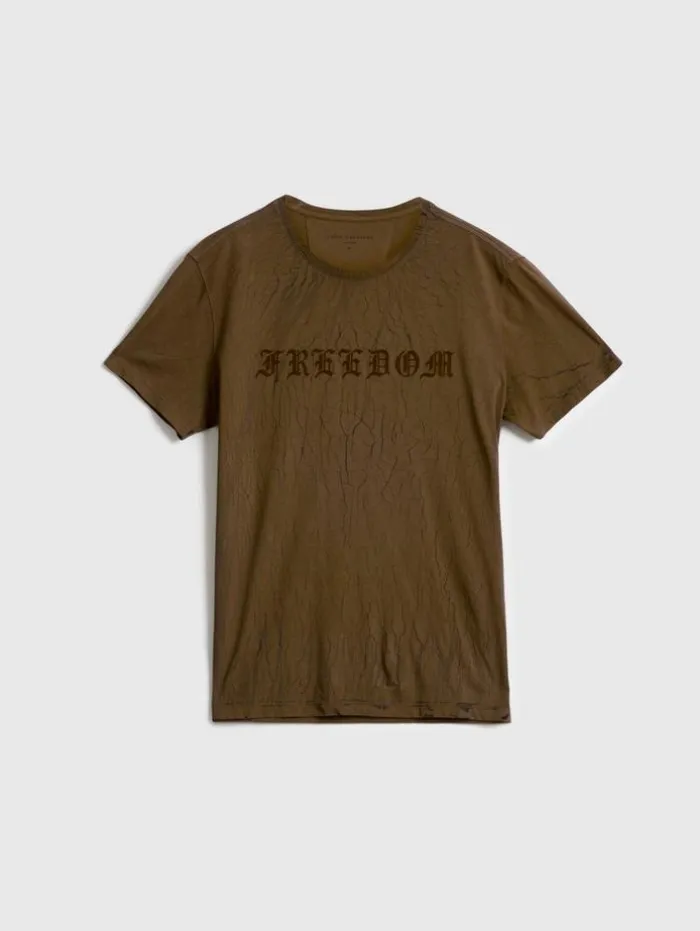 Don the declaration with the Cracked Freedom Tee. A unique cracked wash technique gives it a worn-in appeal, while the ‘FREEDOM’ flocked artwork delivers a bold, textured statement. Pair it with the timeless jeans you covet most and a staple shirt jacket for a look that speaks to the spirit of the JV man.100% CottonMachine Wash ColdCrew NeckShort SleeveCracked Wash TechniqueFreedom ArtworkMeasurements: Body Length: 28″, Chest Width (Flat): 20.5″, Sleeve Length: 16.75″