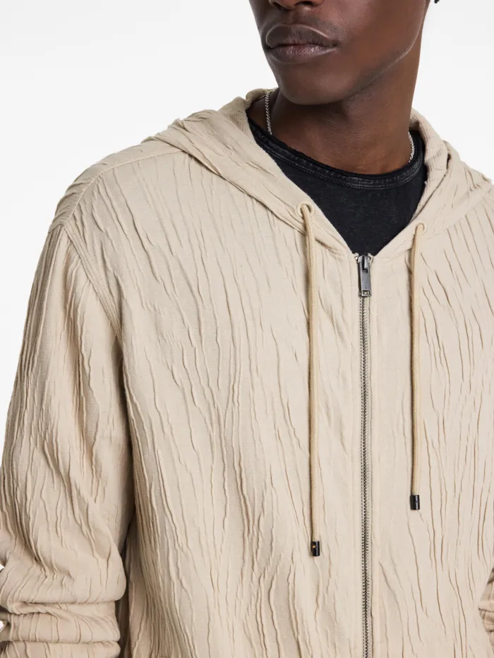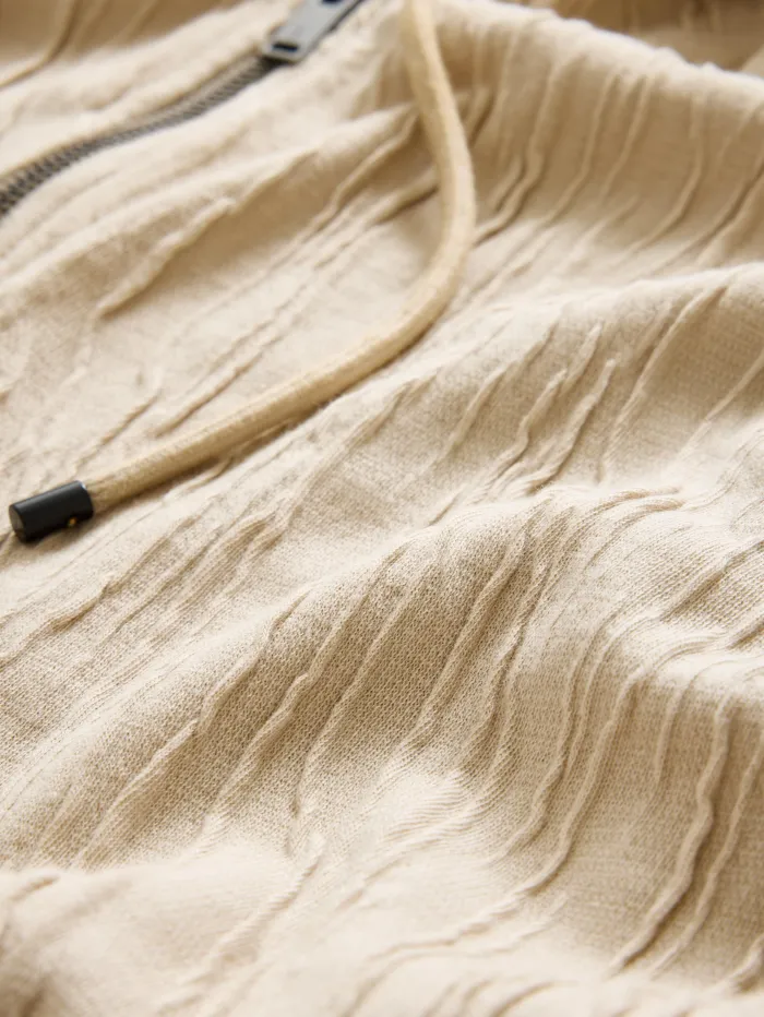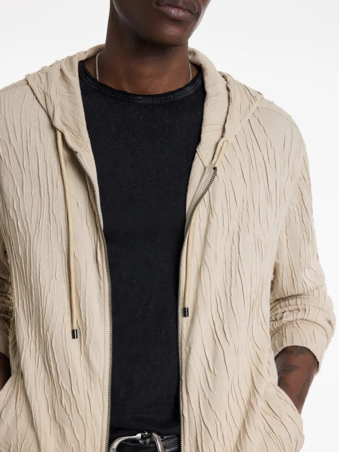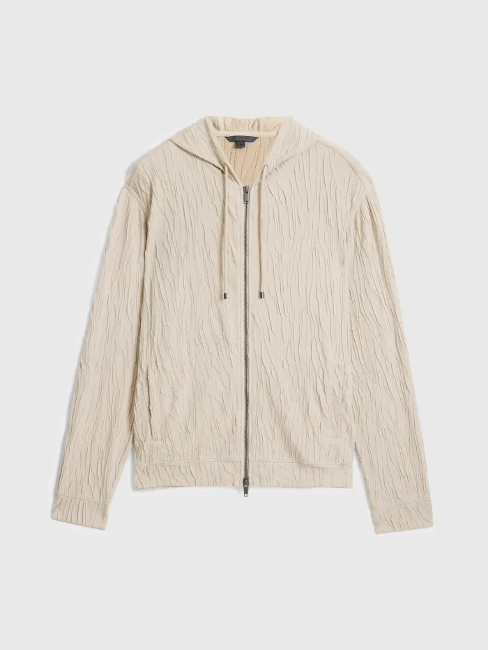 Quiet luxury defines your off-duty days with the Ihsan Hoodie. It’s all in the feel of the jacquard fabric, where every thread speaks to relaxed sophistication and a distinctive tactile experience. The sleek metal double zipper, subtly embossed with the JV logo, adds the right amount of edge. Personalize the fit with adjustable drawstrings finished with our signature metal aglets. Practical single welt pockets add a sleek finish to the design. Layer this hoodie over a crisp tee or under a structured jacket to effortlessly enhance your look with visual allure. 99% Cotton, 1% Elastane Machine Wash ColdDouble ZipperLong SleeveDrawstringSingle Welt Waist PocketsTextured Jacquard FabricMeasurements: Body Length: 27″, Chest Width (Flat): 20.5”, Shoulder Width: 17.75”, Sleeve Length from Center Back: 34.5″