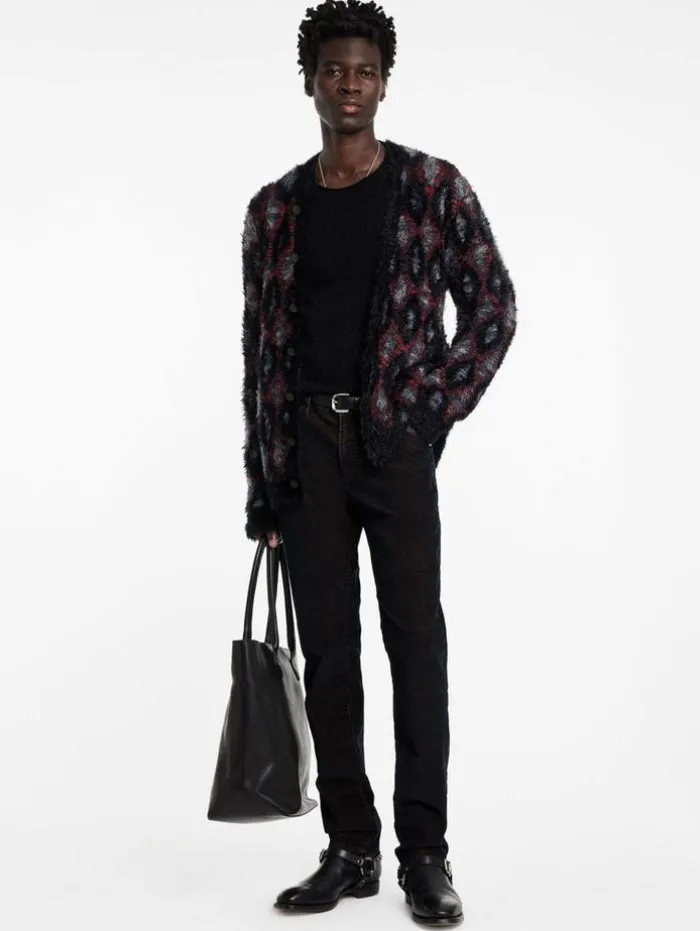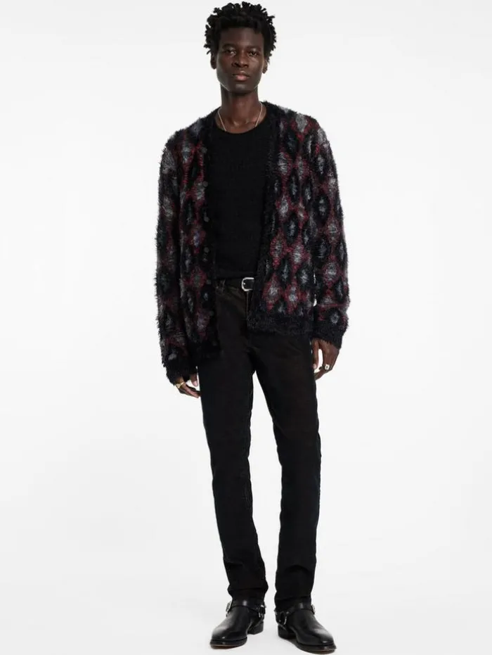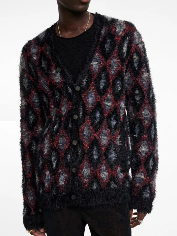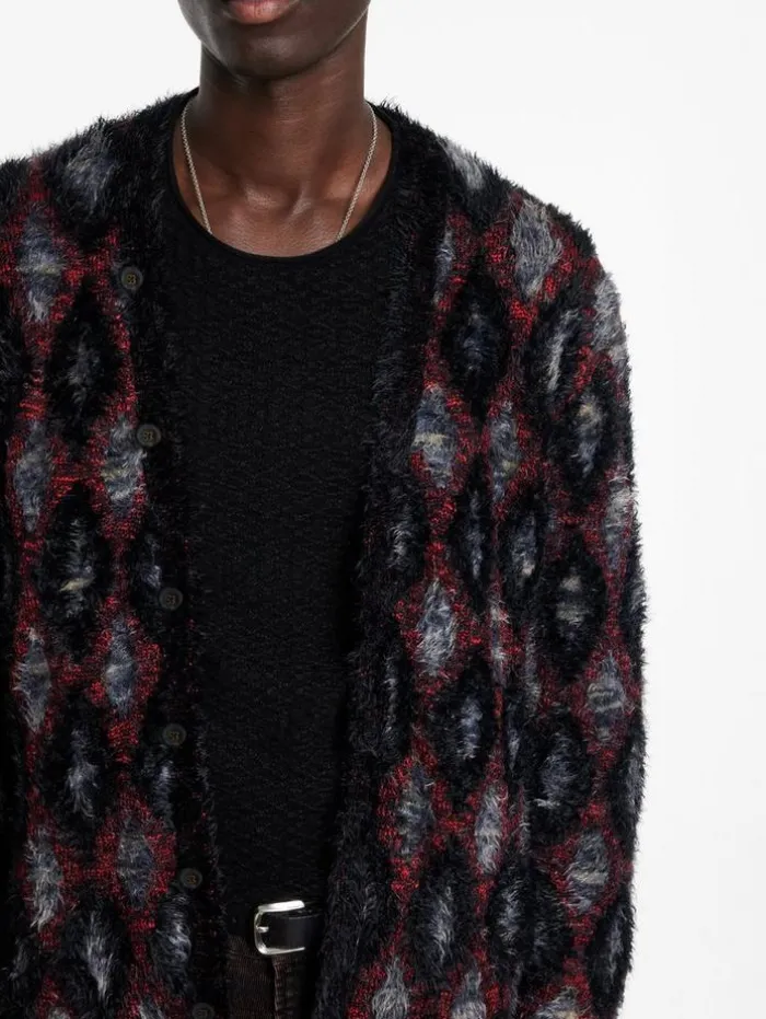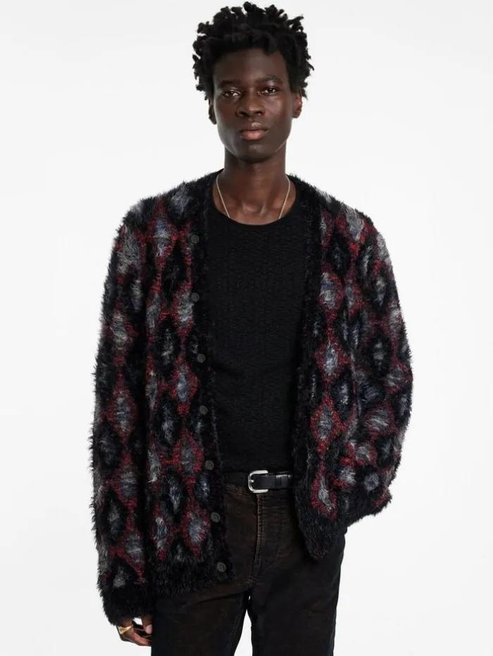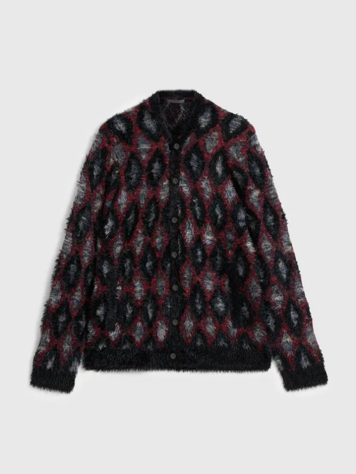 Forget everything you know about the classic cardigan—the Layne Cardigan is crafted differently. Its chunky diamond stitch, inspired by the intricate patterns of Gothic stained glass, brings depth and character to the soft, fuzzy black yarns. Finished with antiqued horn buttons for a touch of timeless craftsmanship, this regular-fit cardigan is your go-to piece. Whether dressed up or down, it’s a bold yet versatile statement.100% Acetate + 100% Polyamide + 87% Polyester, 11% Rayon, 2% ElastaneHand wash coldRegular fitLong sleeveAntiqued horn button closureDiamond stitchMeasurements: Body Length: 27”, Shoulder Width: 17.5”, Chest Width: 21.5”, Sleeve Length: 34.5”