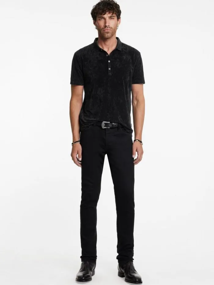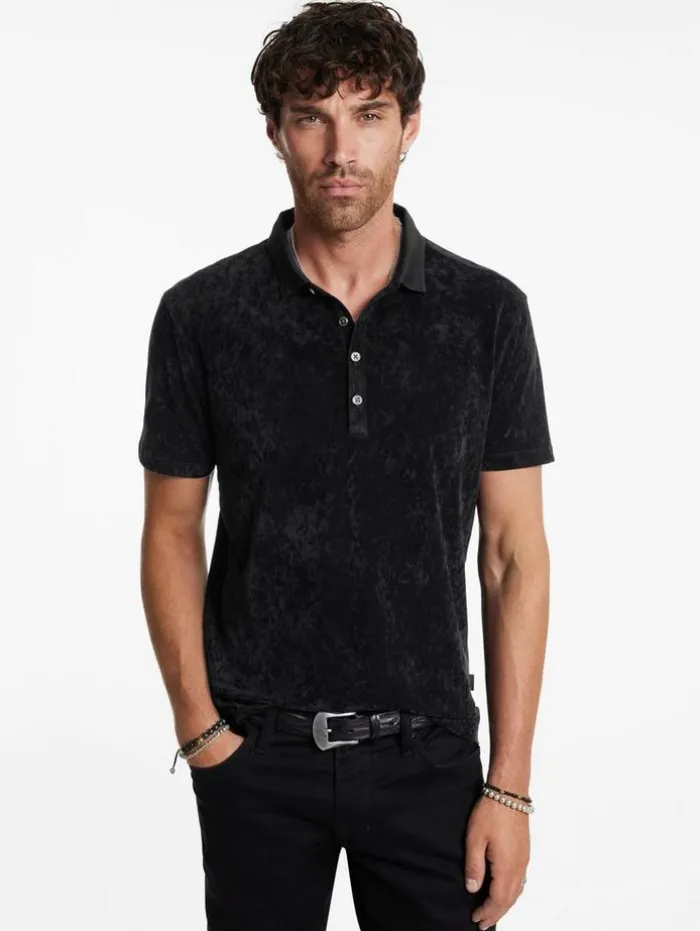 Casual dressing takes a bold turn with the Torres Polo this season. Luxuriously soft to the touch, this piece redefines everyday style with its velvet-like texture and sophisticated ribbed collar, elegantly adorned with sweater trim. Antique brushed metal buttons finish the look with a hint of nostalgia. Effortlessly stylish, this polo does the heavy lifting; pair it with jeans and a long-lined coat for an ensemble that stands out.66% Triacetate, 25% Polyester, 9% PolyurethaneDry cleanRibbed collarShort sleeveRegular fitAntique brushed metal buttonsHigh low matte velvet textureSeam detail at button placketMeasurements: Body Length: 27.5”, Shoulder Width: 18”, Chest Width: 20.25”, Sleeve Length: 34.75”