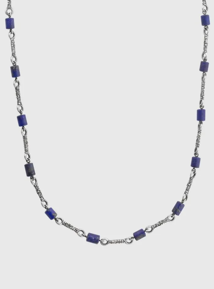 Jewelry with attitude – this necklace is crafted from sterling silver. Detailed with precious lapis beads with woven links inbetween.. Sterling SilverLength: 24.5″Lobster Clasp ClosureStationPrimary Stone: LapisHandcrafted in Istanbul